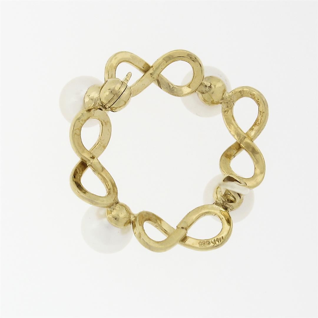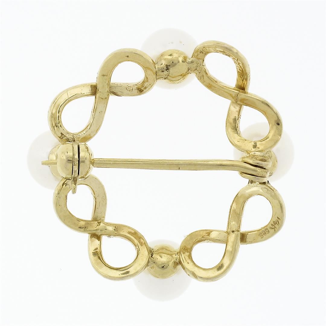 A vintage solid 14k yellow gold wreath infinity pin brooch, with 4 round shape cultured pearls (5.9mm each). Measures 25.90x25.30mm and weighs a total of 3.60 grams.