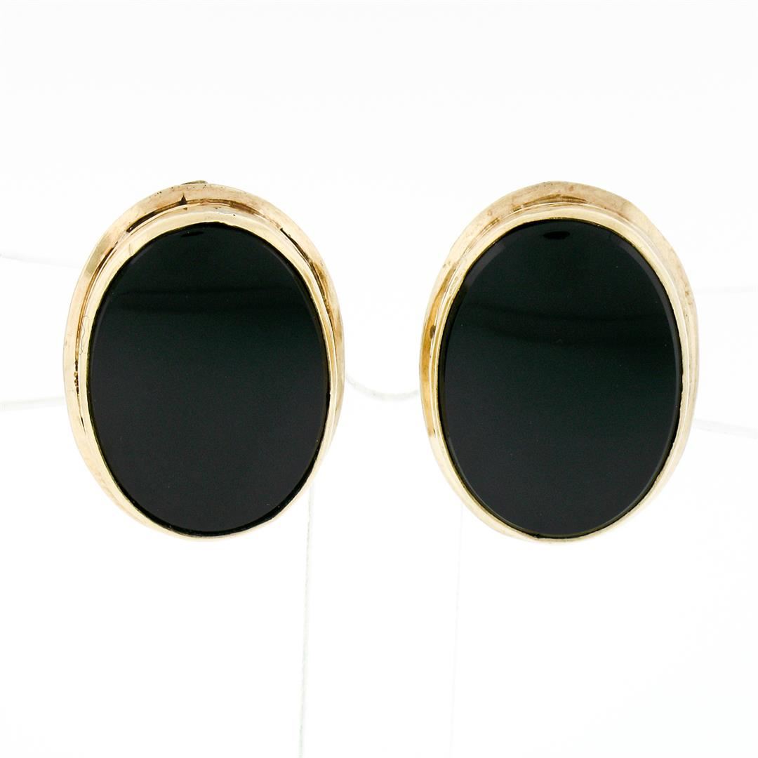 Vintage 14k Yellow Gold Bezel Set Oval Black Onyx Button Screw-On Earrings