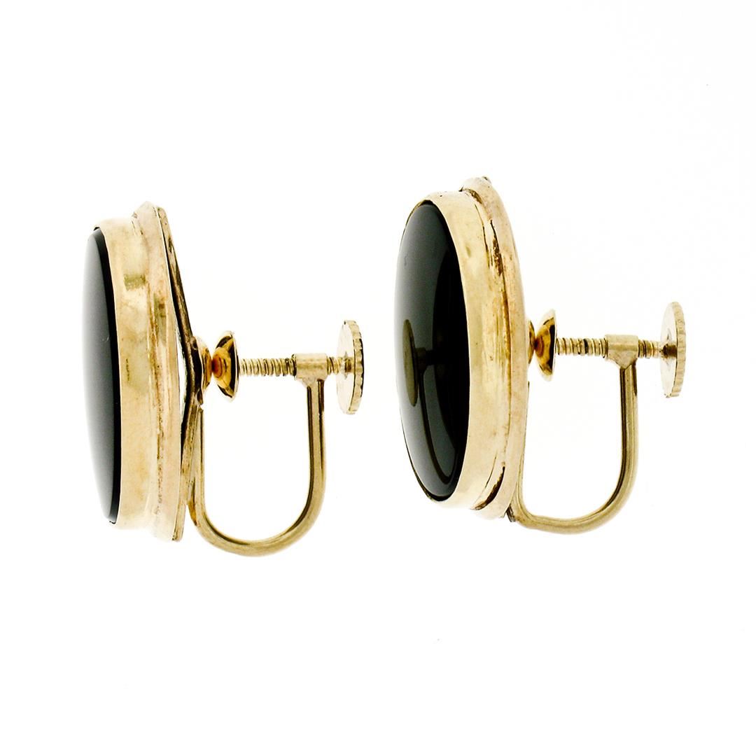 Vintage 14k Yellow Gold Bezel Set Oval Black Onyx Button Screw-On Earrings