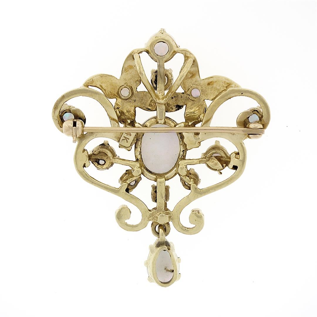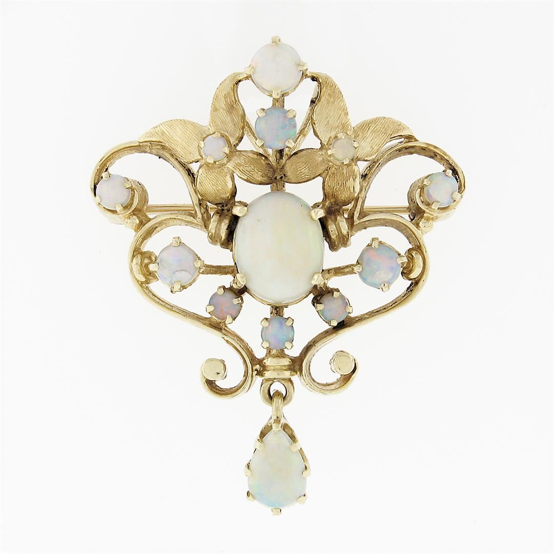 A vintage solid 14k yellow gold pin broch pendant, with 1 oval cabochon cut natural opal (10x8mm), & 1 pear cabochon cut natural opal (8x5.3mm), with 11 round cabochon cut natural opals (4.6mm to 2.3mm). Measures 42.55x#34mm and weighs a total of 10.20 grams.