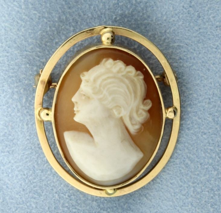 1.25 x 1 inch. 14k Yellow gold surrounds cameo. 7.3g