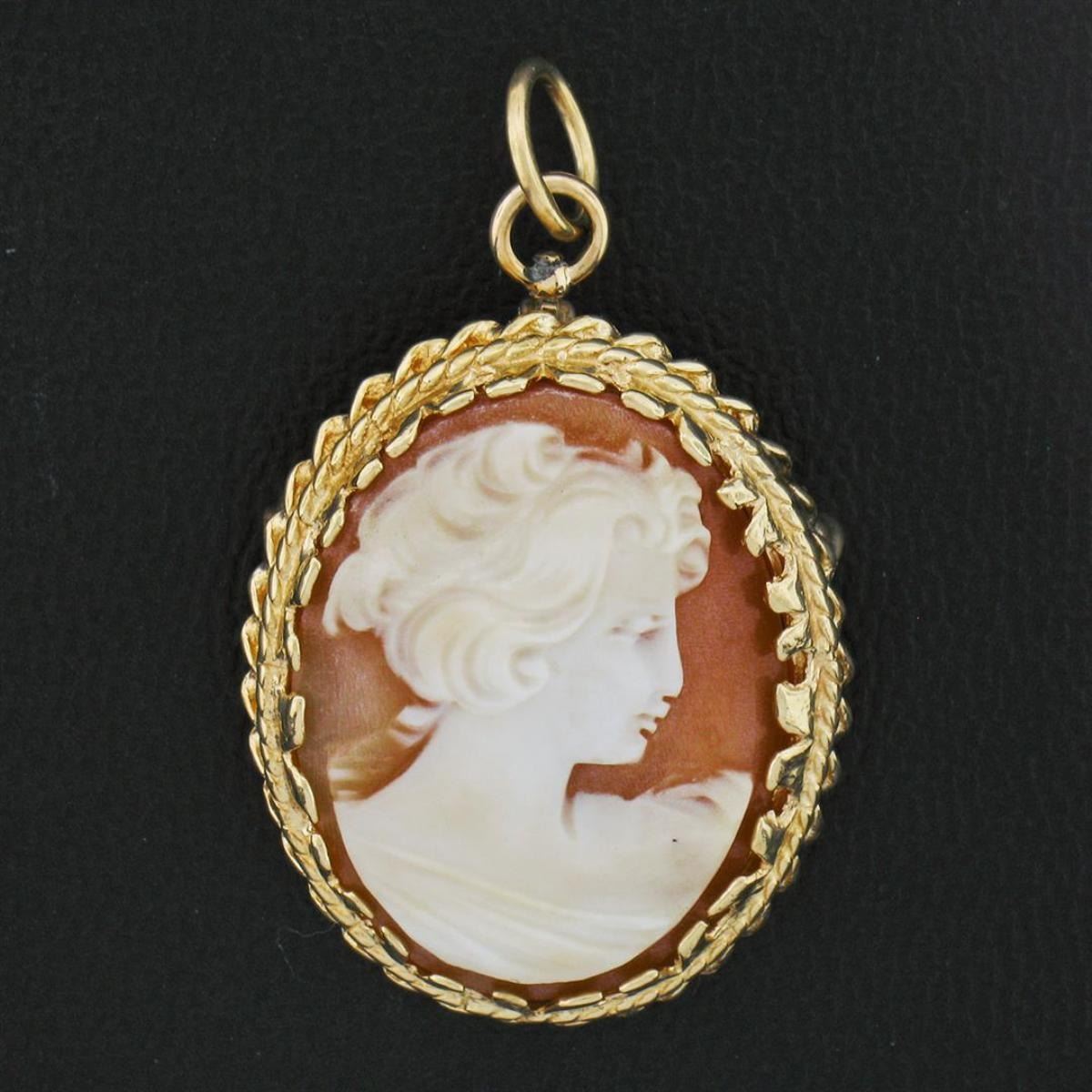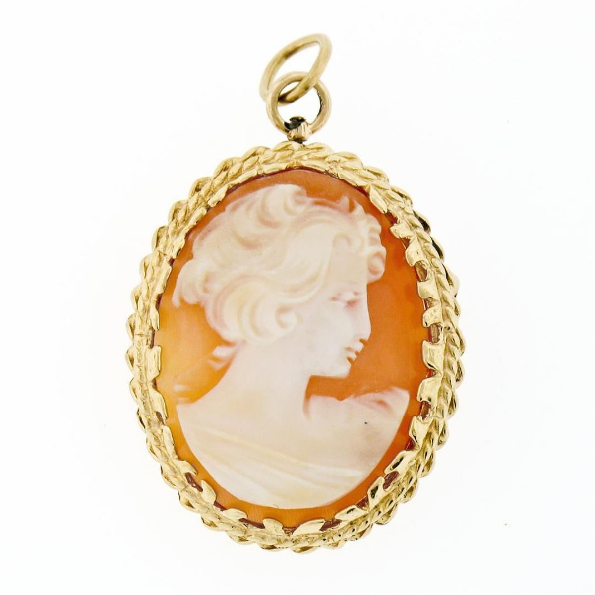 Vintage 14k Yellow Gold Carved Shell Cameo Dual Twisted Wire Brooch Pin Pendant. A vintage solid 14k yellow gold pendant featuring an oval carved natural shell cameo (24.65x19.45mm) surrounded by a dual twisted wire frame. Measures 39.55x23.55mm and weighs a total of 7.61 grams.