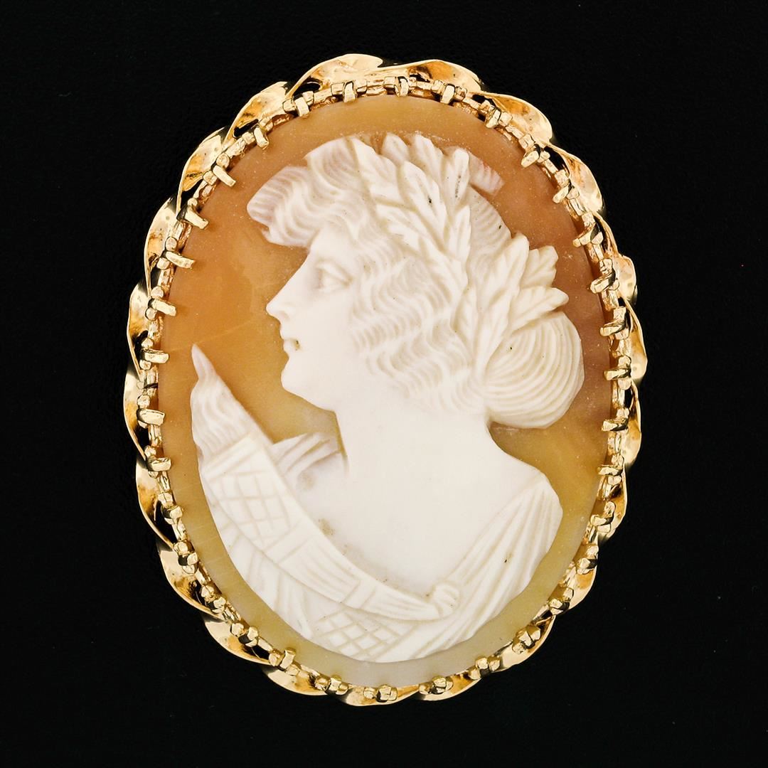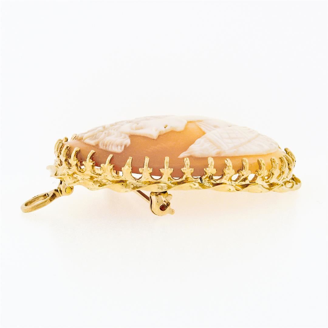 A vintage solid 14k yellow gold brooch pendant, with 1 oval cut carved shell cameo (35.40x27.35mm). Measures 44.25x31.60mm and weighs a total of 11.21 grams.