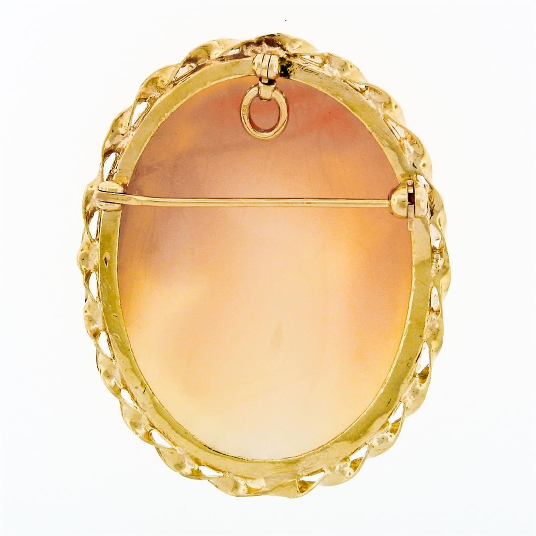 A vintage solid 14k yellow gold brooch pendant, with 1 oval cut carved shell cameo (35.40x27.35mm). Measures 44.25x31.60mm and weighs a total of 11.21 grams.