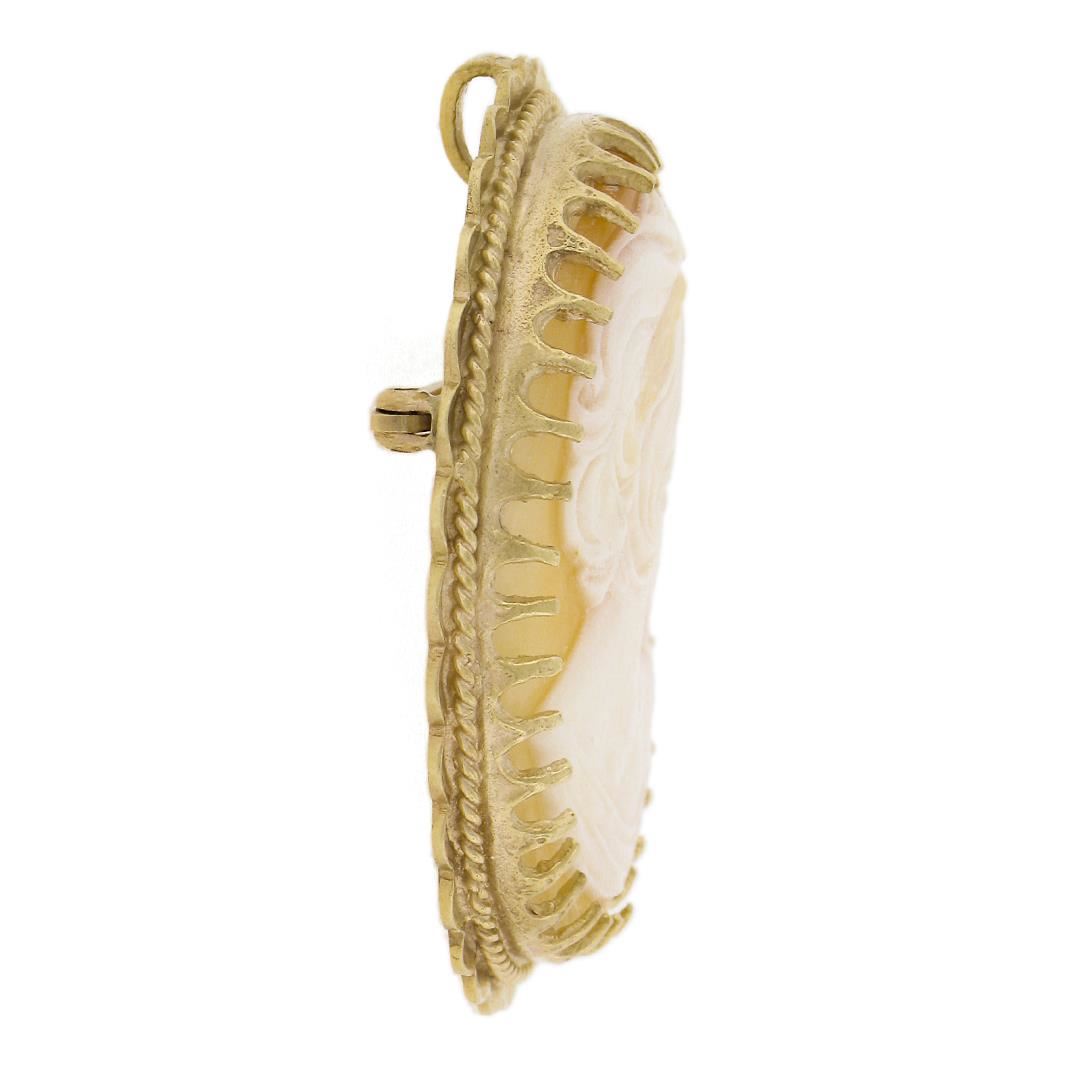 A vintage solid 14k yellow gold brooch pendant, with 1 oval carved cameo shell (35.3x26.5mm ). Measures 42.9x34.2mm and inside bail dimensions 4.3x2mm, it weighs a total of 13 grams.