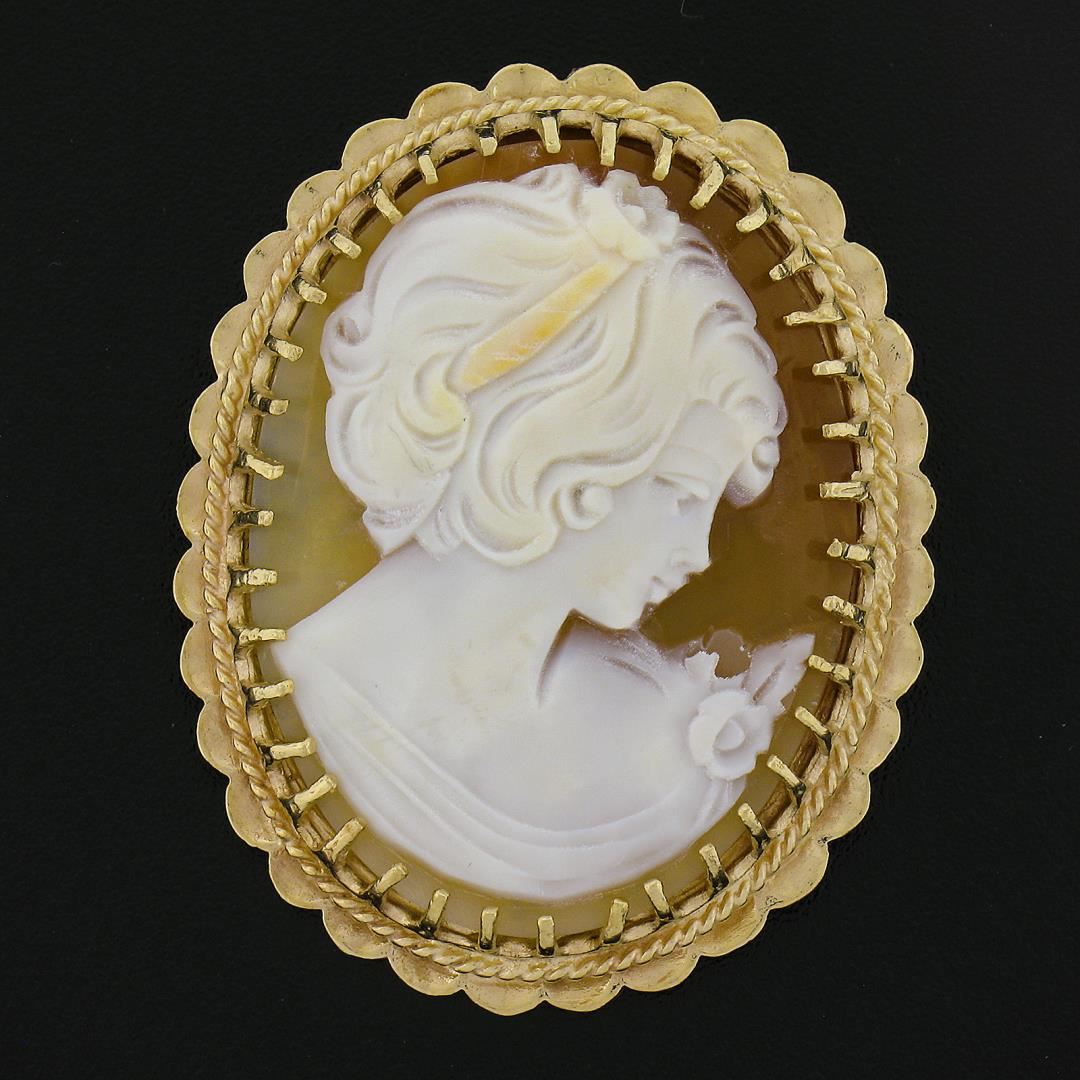 A vintage solid 14k yellow gold brooch pendant, with 1 oval carved cameo shell (35.3x26.5mm ). Measures 42.9x34.2mm and inside bail dimensions 4.3x2mm, it weighs a total of 13 grams.