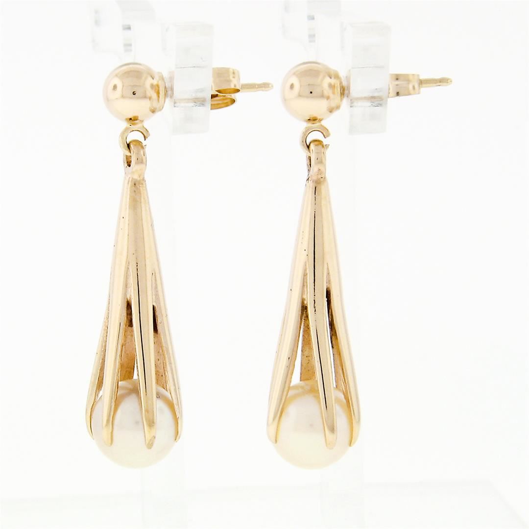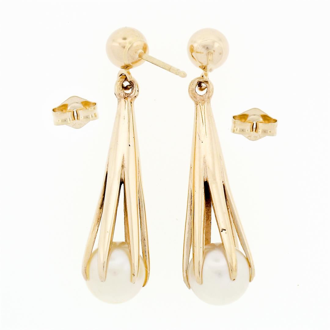 An vintage solid 14k yellow gold drop dangle earrings, featuring 2 round shape natural cultured pearl ( 7.05mm). The earrings measure approximately 33.22x7.52mm and weigh a total of 4.71 grams.