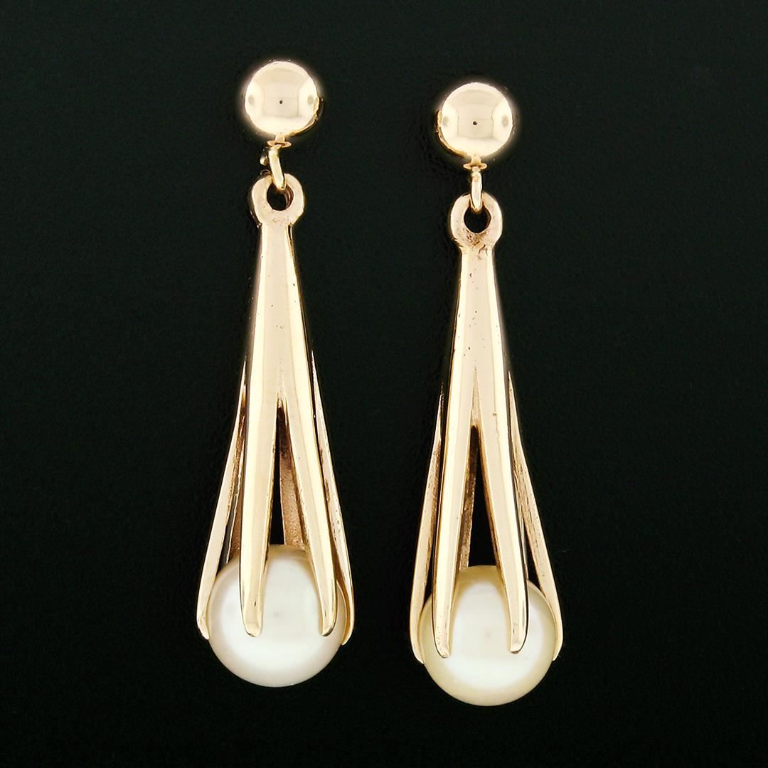 Vintage 14k Yellow Gold Claw Set 7.0mm Round Cultured Pearl Drop Dangle Earrings