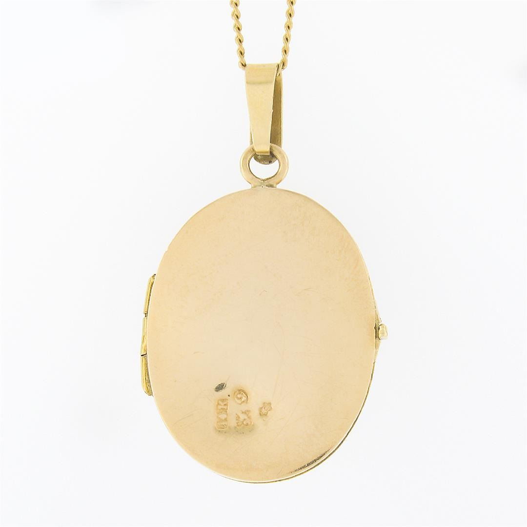 A vintage solid 14k yellow gold locket pendant necklace, with enamel work. The pendant weighs a total of 12.86 grams, measures 40.90x24mm including the bail, and 20 inch curb link chain.