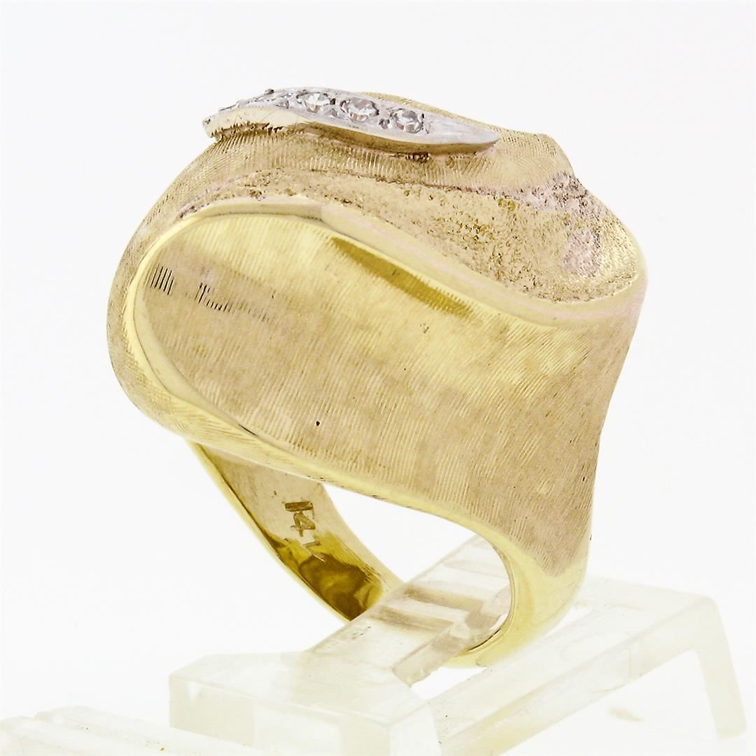 A solid 14k yellow gold Florentine finish ring, with 5 single cut natural diamonds (F - VS1 ; 0.10ctw). The ring is size 7.5, weighs a total of 17.40 grams, and measures 26.7mm wide.