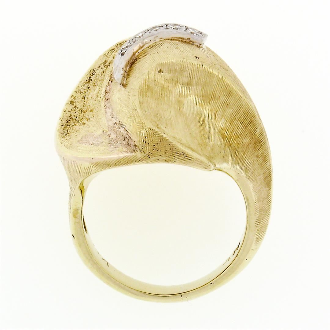 A solid 14k yellow gold Florentine finish ring, with 5 single cut natural diamonds (F - VS1 ; 0.10ctw). The ring is size 7.5, weighs a total of 17.40 grams, and measures 26.7mm wide.