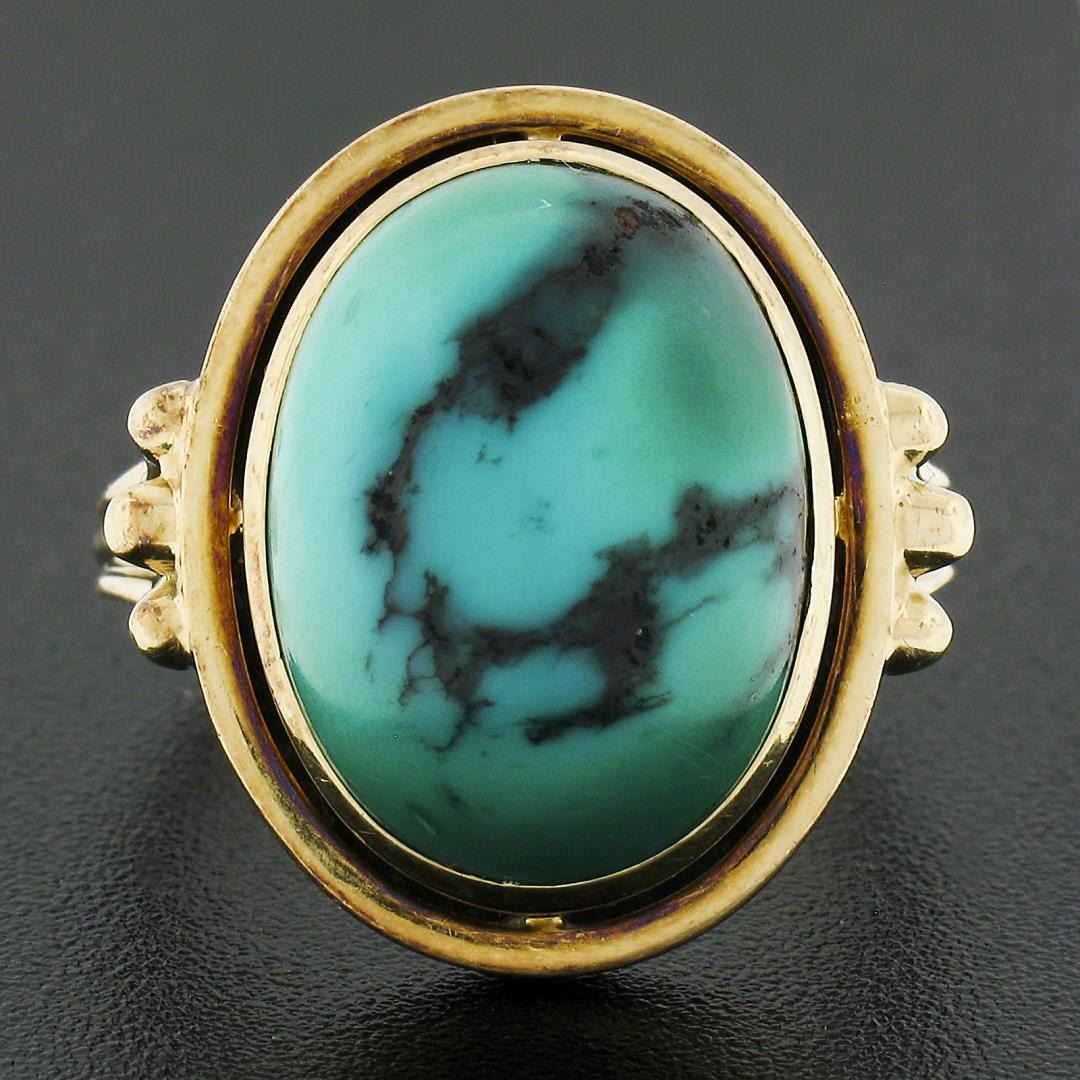 a vintage solid 14k yellow gold ring, with 1 oval cabochon cut natural turquoise (15.9x12mm). The ring is size 7.0, weighs a total of 6.46 grams, and measures 20.1mm wide.