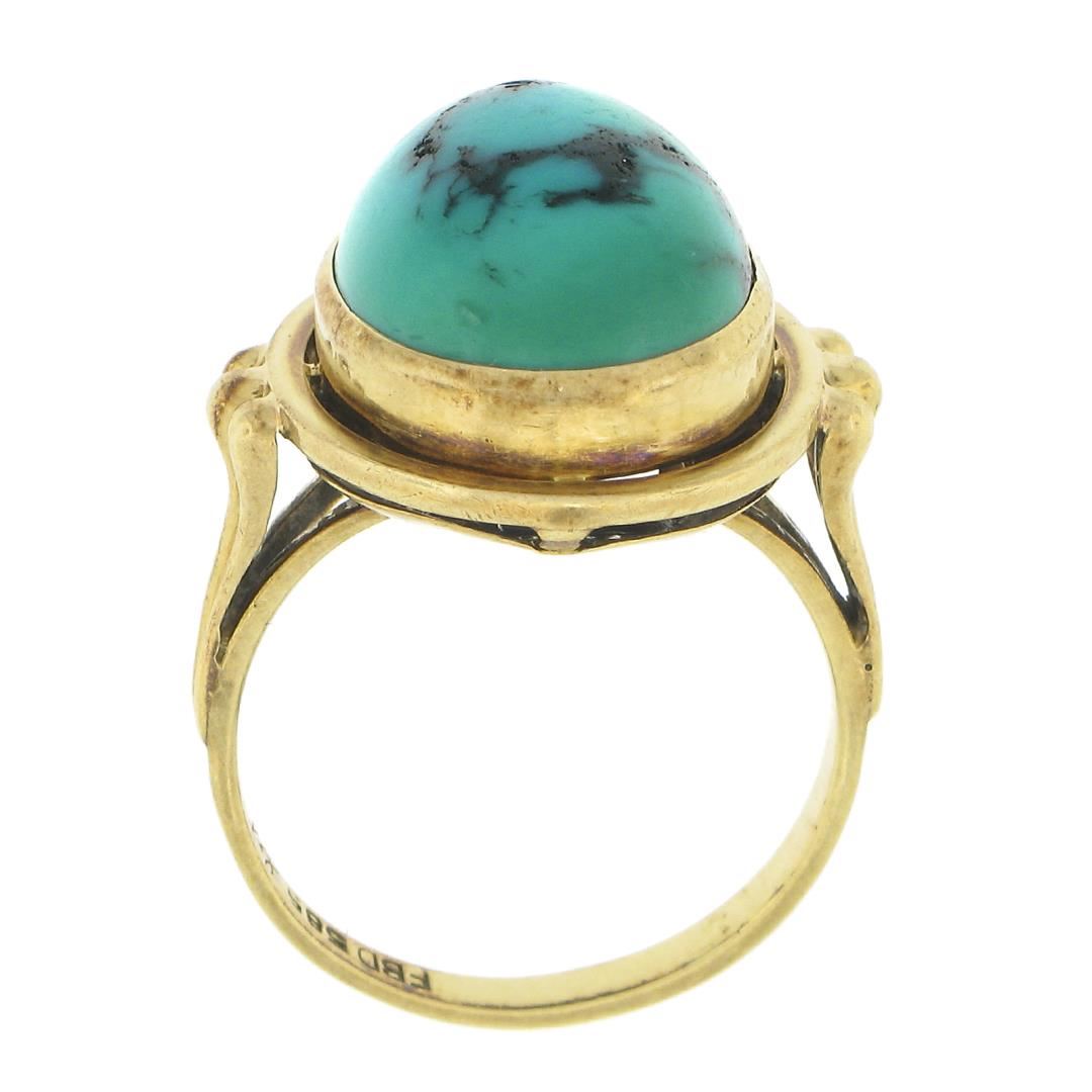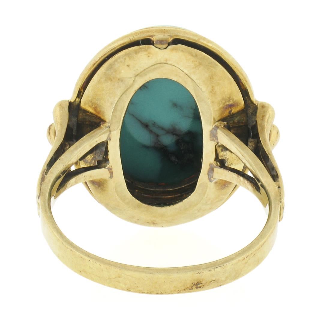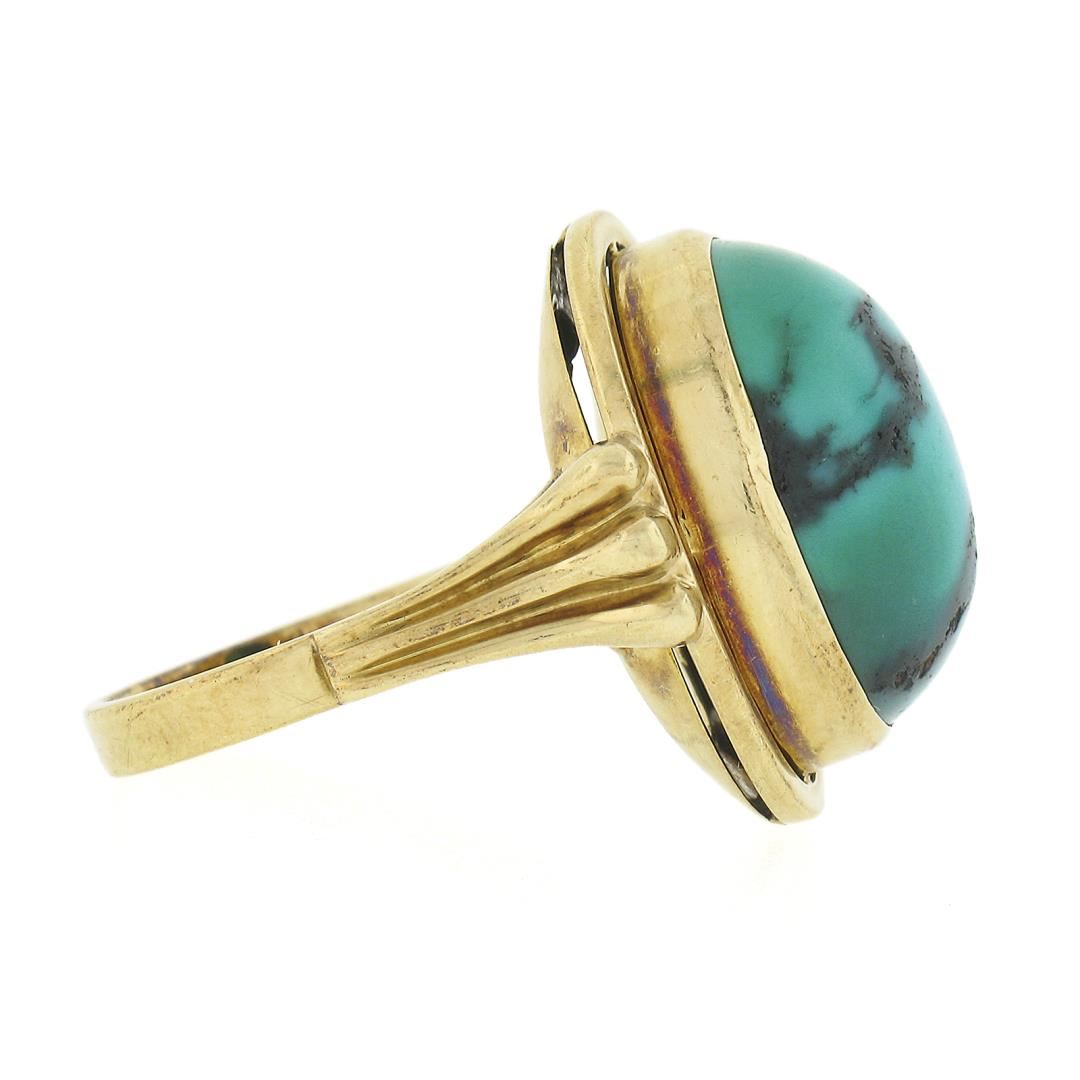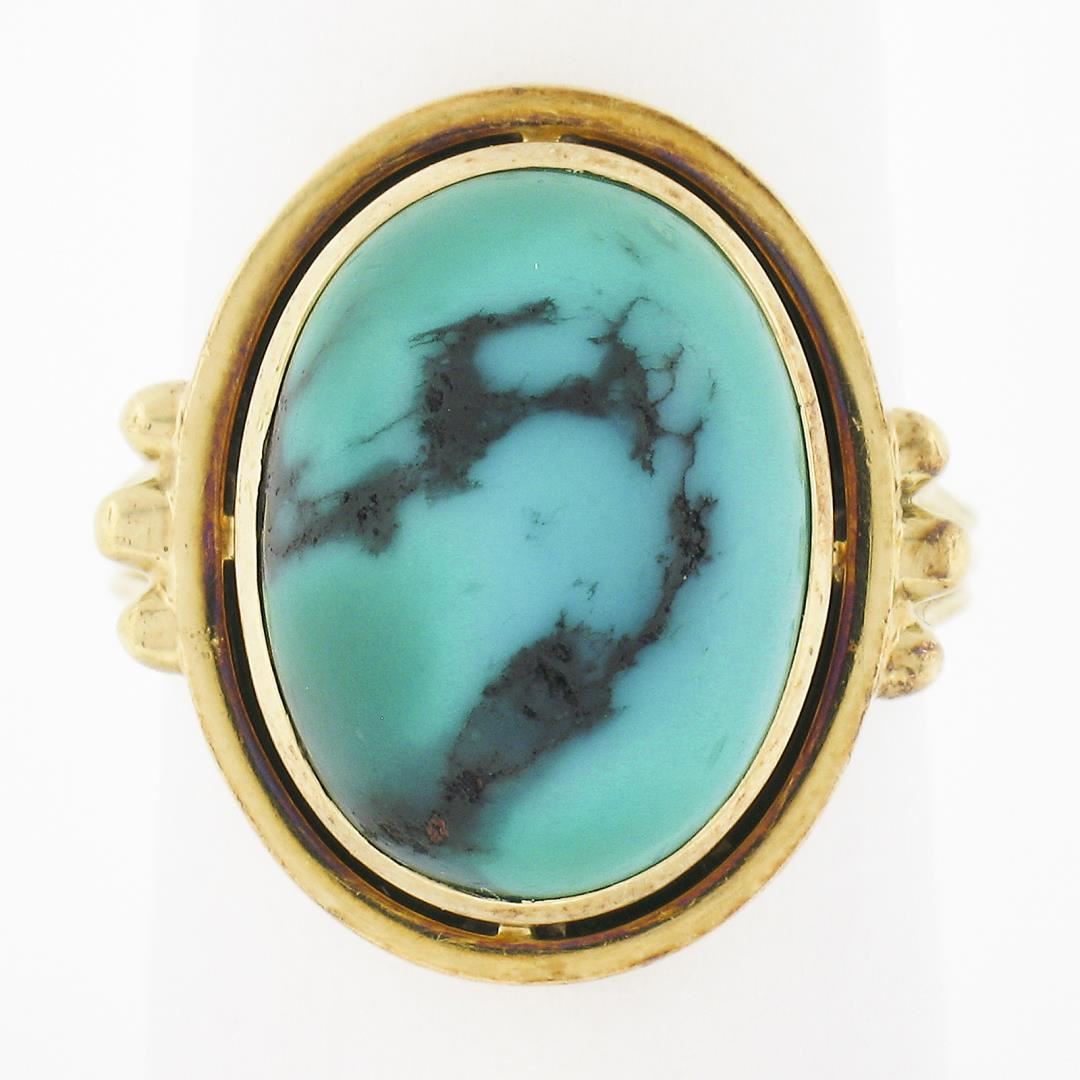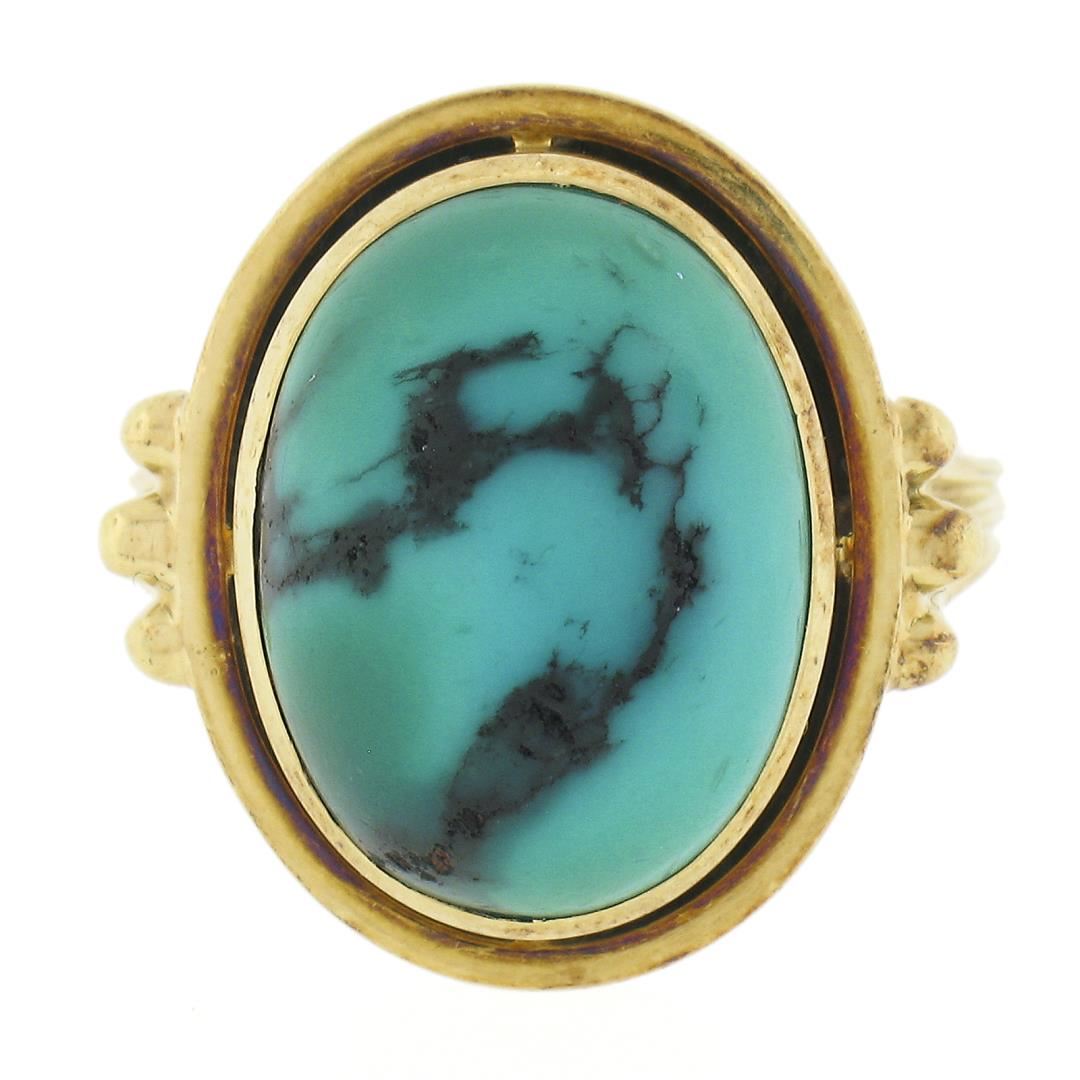 a vintage solid 14k yellow gold ring, with 1 oval cabochon cut natural turquoise (15.9x12mm). The ring is size 7.0, weighs a total of 6.46 grams, and measures 20.1mm wide.