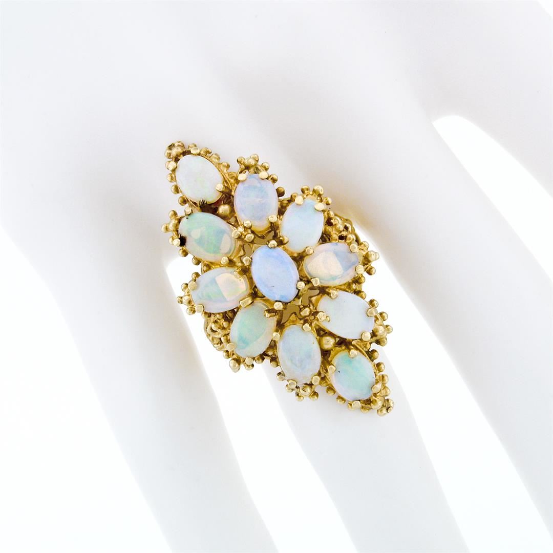 A vintage soldi 14k yellow gold cocktail ring, with 11 oval cabochon cut natural opal (7x5mm). The ring is size 8.5, weighs a total of 10.53 grams, and measures 40.45mm wide.