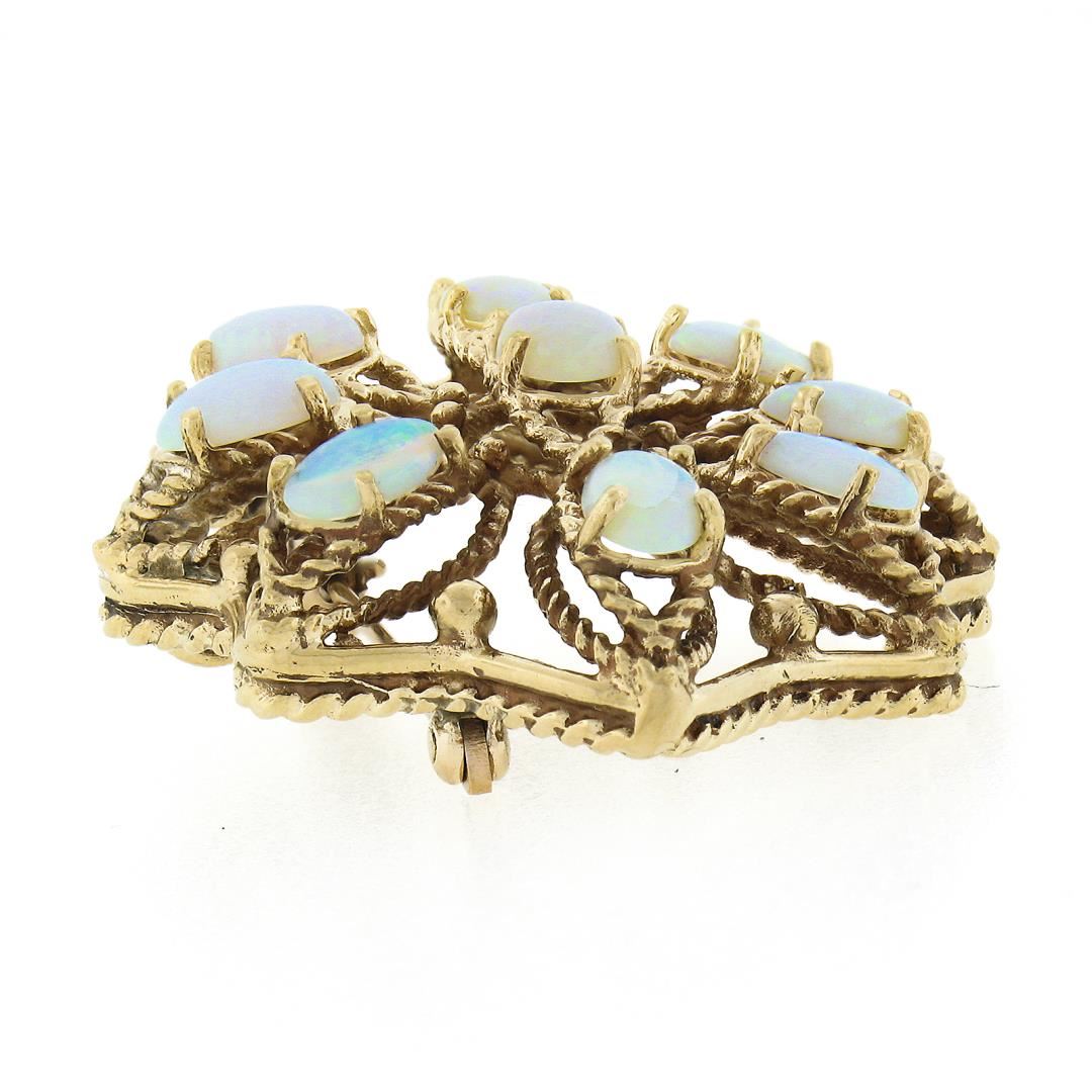 A vintage solid 14k yellow gold brooch pendant, with 9 oval cabochon cut natural opals (6x4mm each). Measures 30x36.3mm and weighs a total of 8.54 grams.