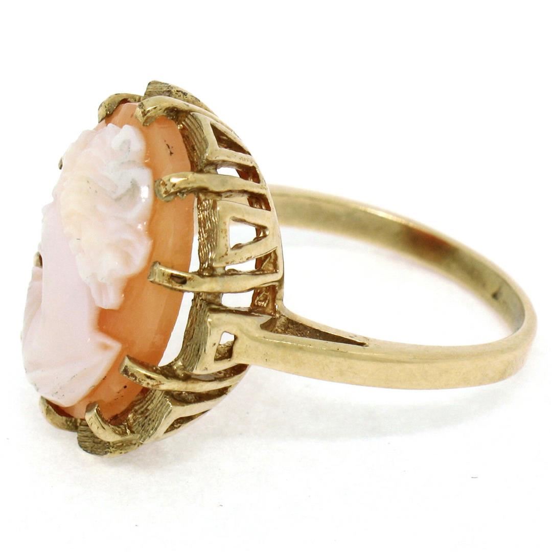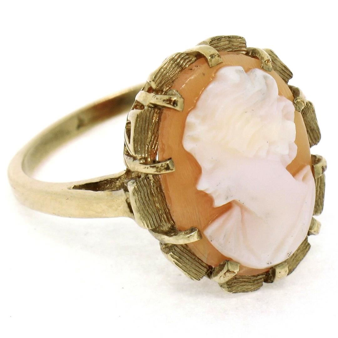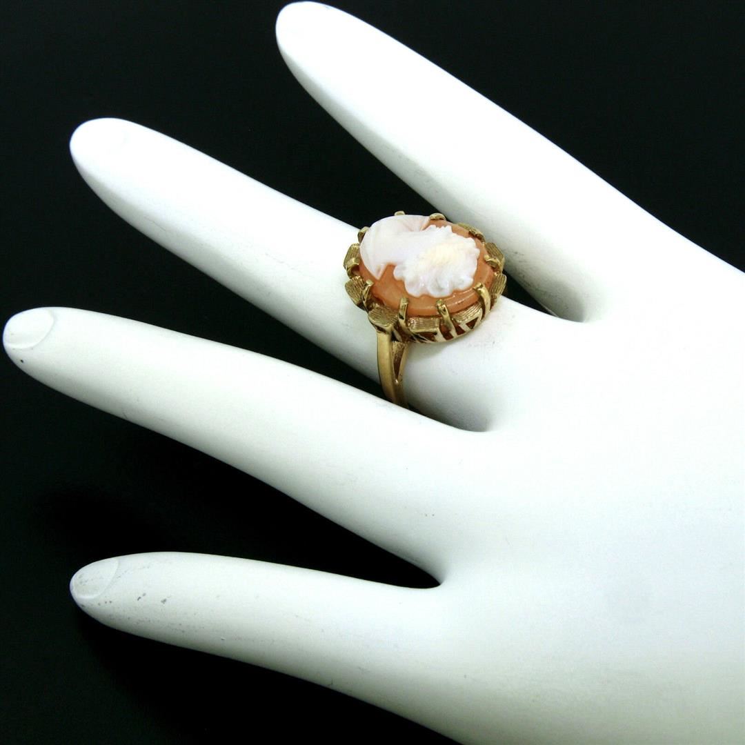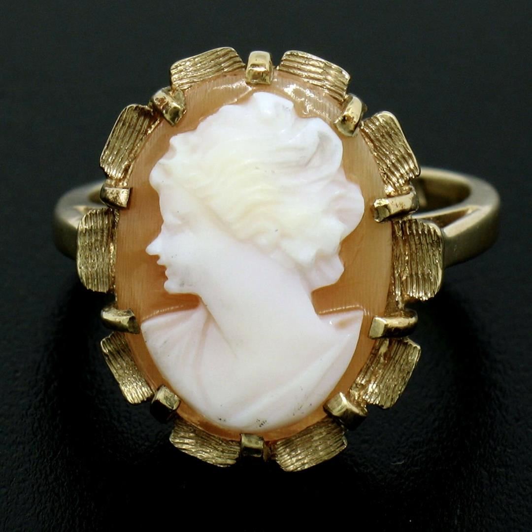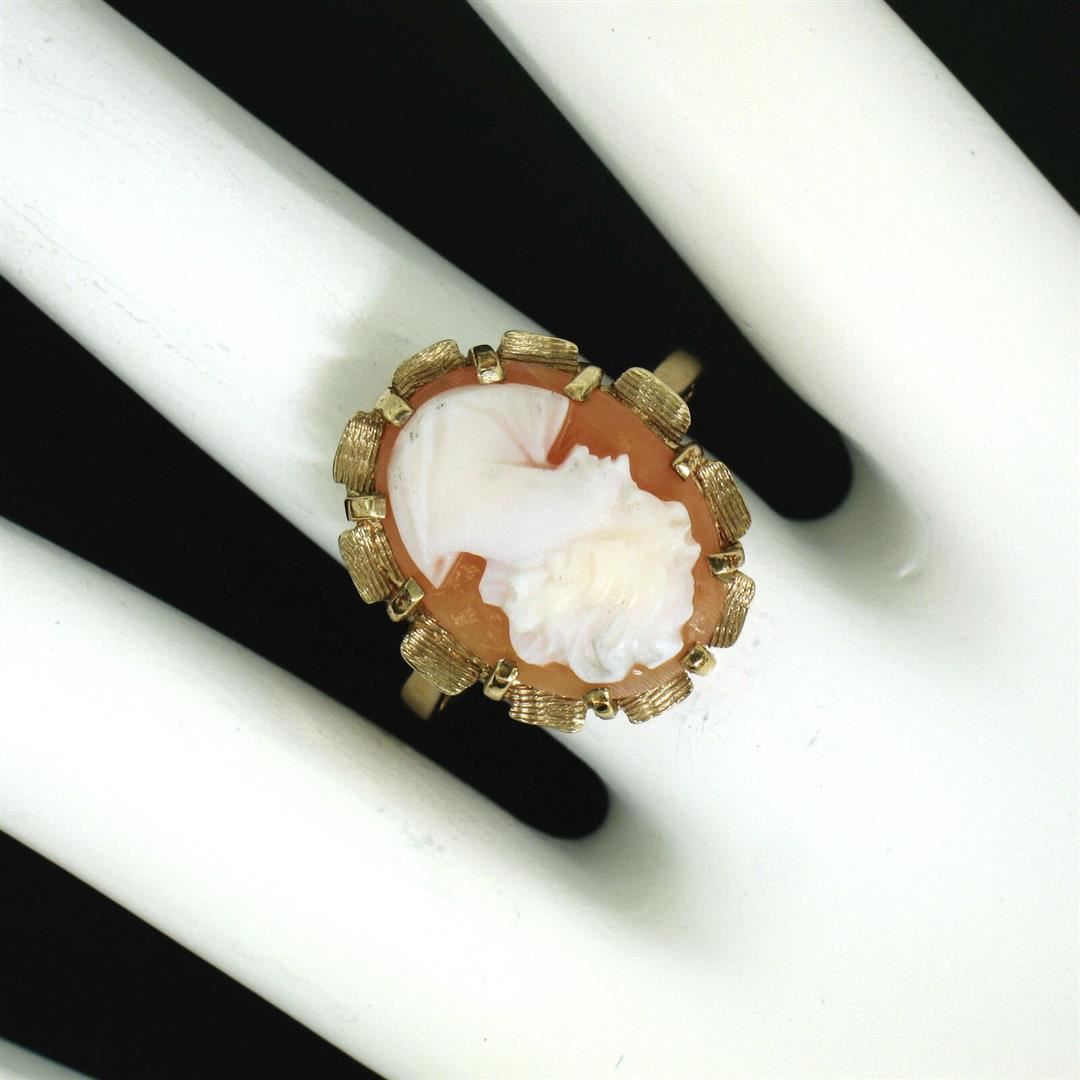 Vintage 14k Yellow Gold Oval Carved Shell Cameo Ring w/ Brushed Finish Frame. A vintage solid 14k yellow gold ring featuring an oval carved natural shell cameo (15.60x11.75mm) surrounded by a flower petal-like frame with a coarsely brushed finish. The rin