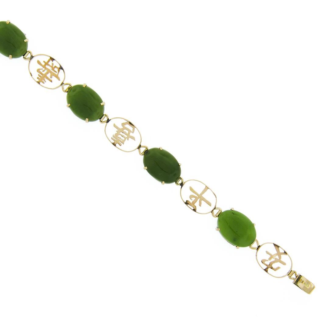 A vintage solid 14k yellow gold symbol link bracelet, with 5 oval cut natural jades (13.6x10mm each). It weighs a total of 9.45 grams, measures 10.3mm wide, and measures 7 inches in length.