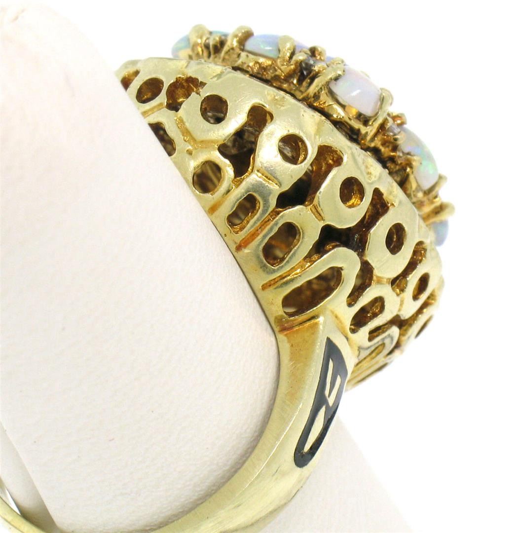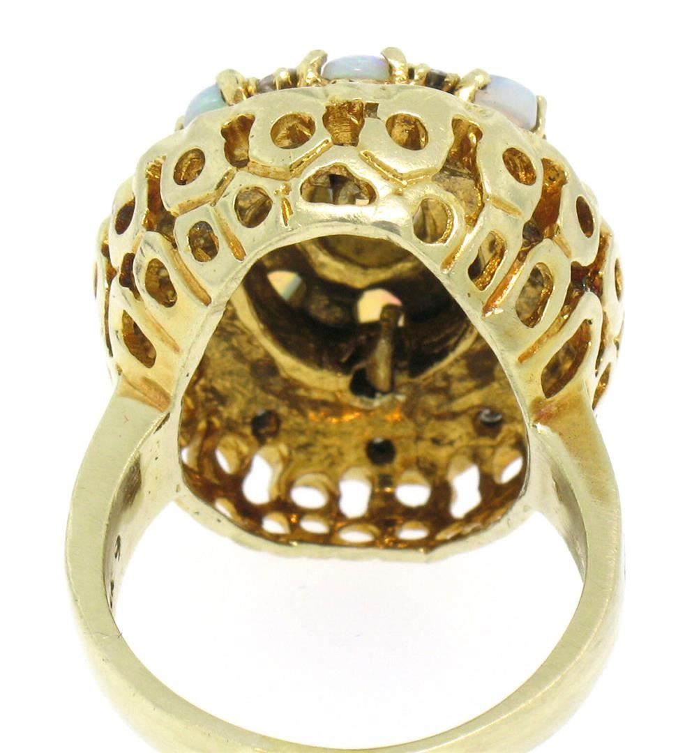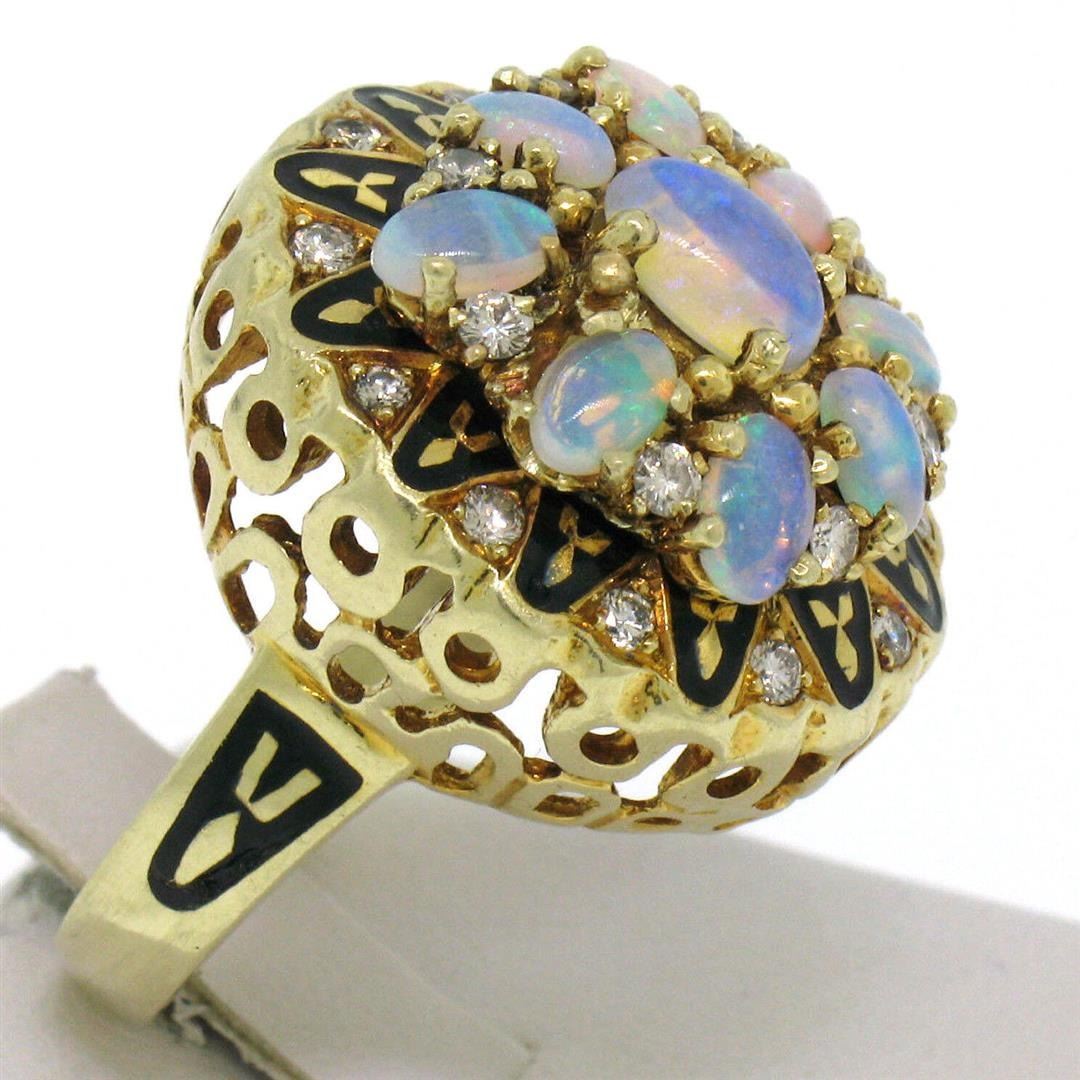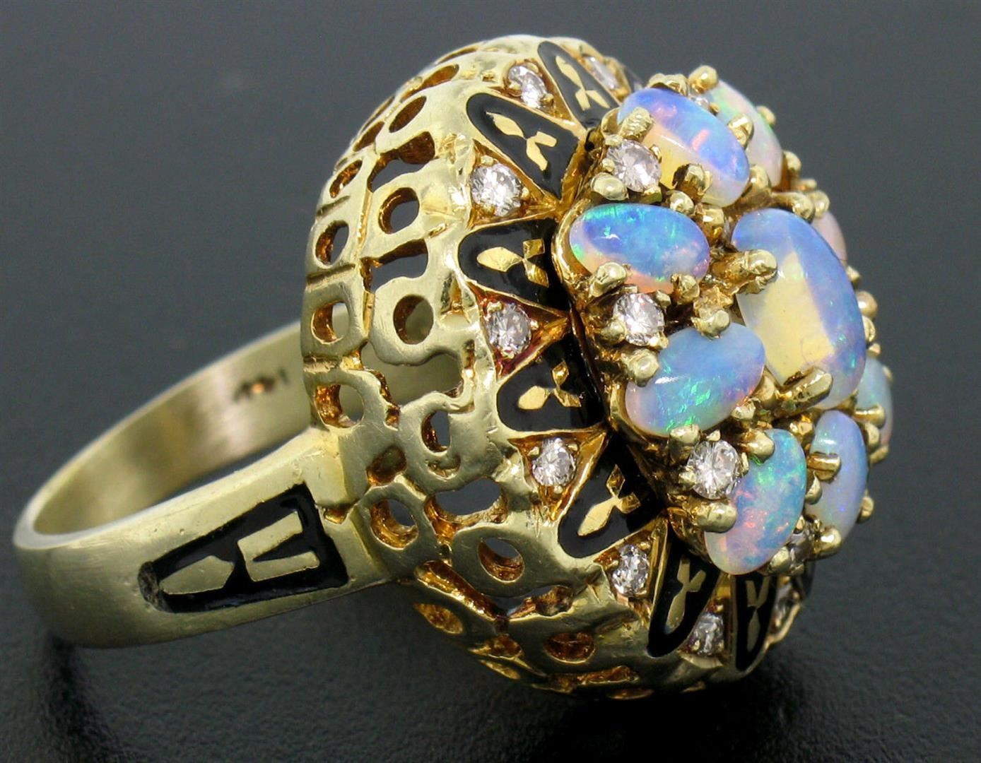 A vintage solid 14k yellow gold cocktail ring, featuring 9 oval cabochon cut natural crystal opal (2.50ctw), and 20 round brilliant cut natural diamonds (F/G- VS1/VS2; 0.40ctw), and balck enamel work. The ring is size 7.0, weighs a total of 18.0 grams, and measures 21.0mm wide.