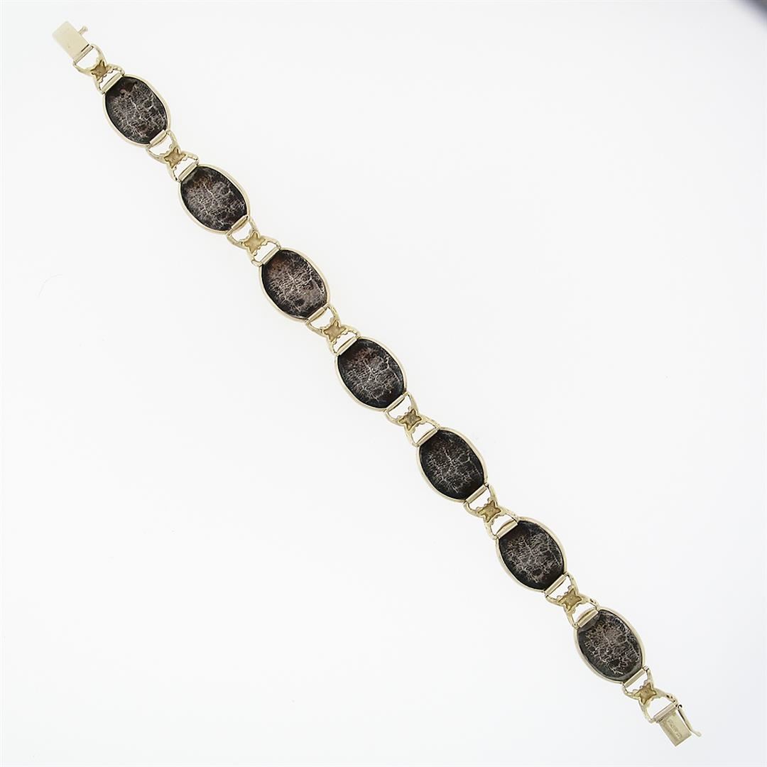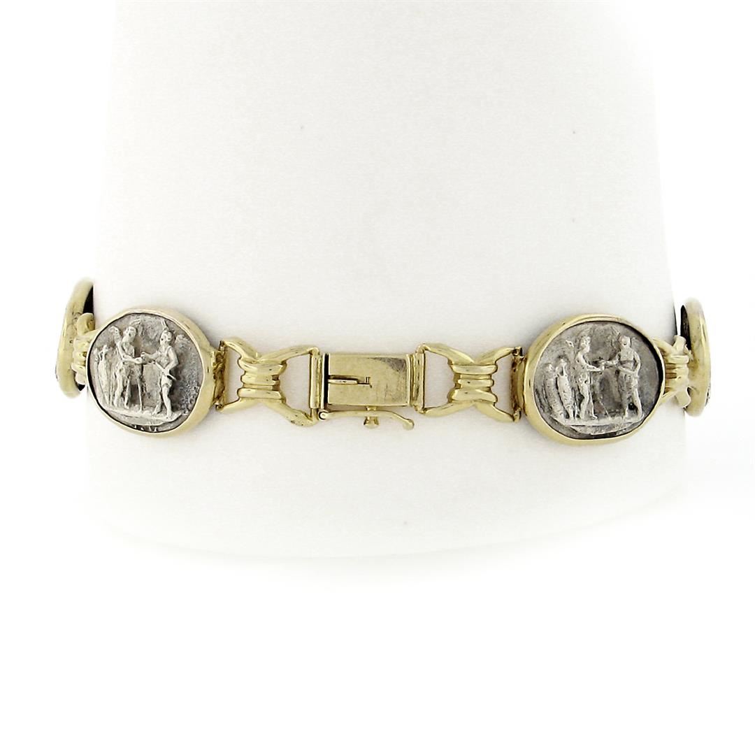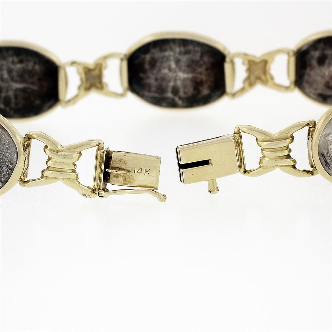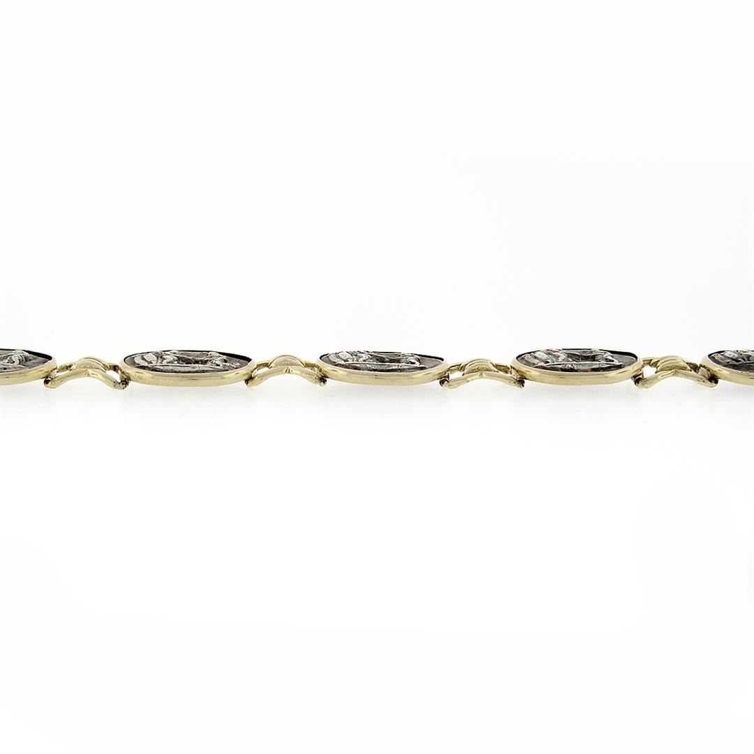 A vintage solid 14k yellow gold & silver chain link bracelet. It weighs a total of 21.48 grams, measures 12.9mm wide, and measures 7.5 inches in length.