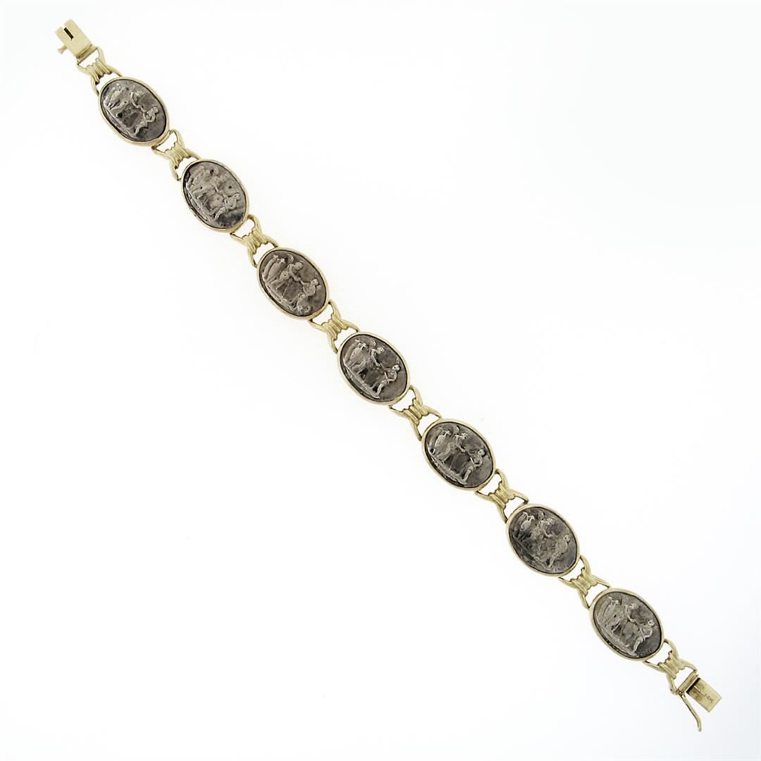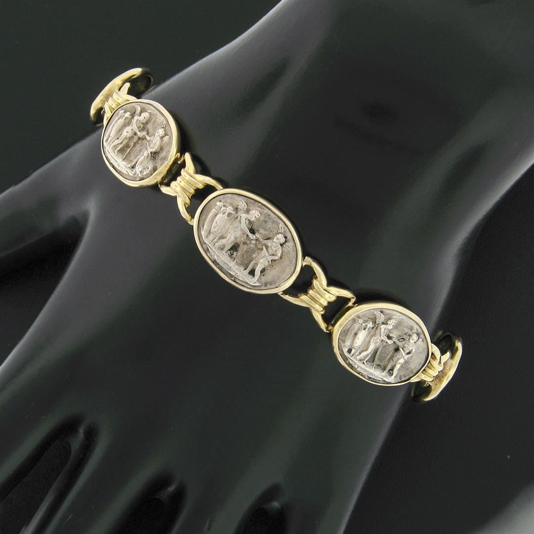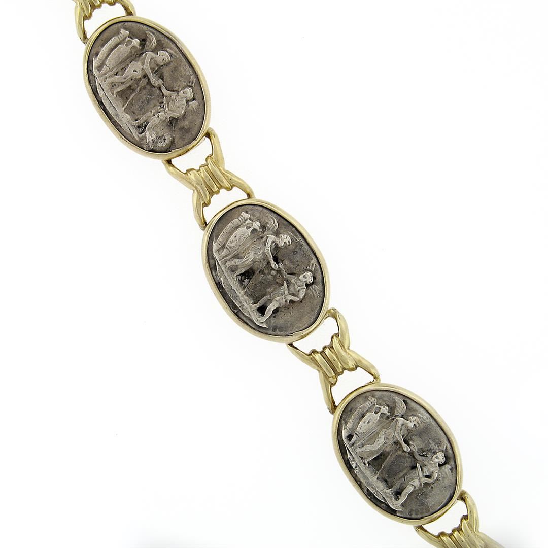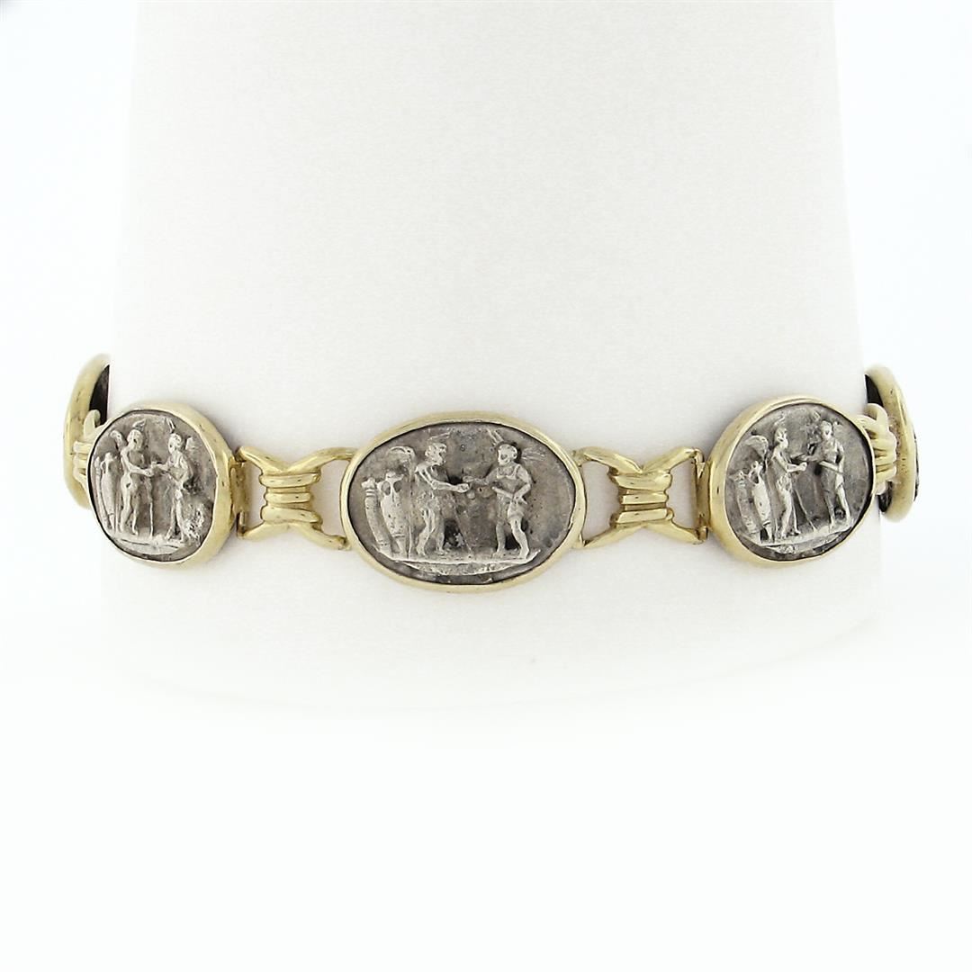 A vintage solid 14k yellow gold & silver chain link bracelet. It weighs a total of 21.48 grams, measures 12.9mm wide, and measures 7.5 inches in length.