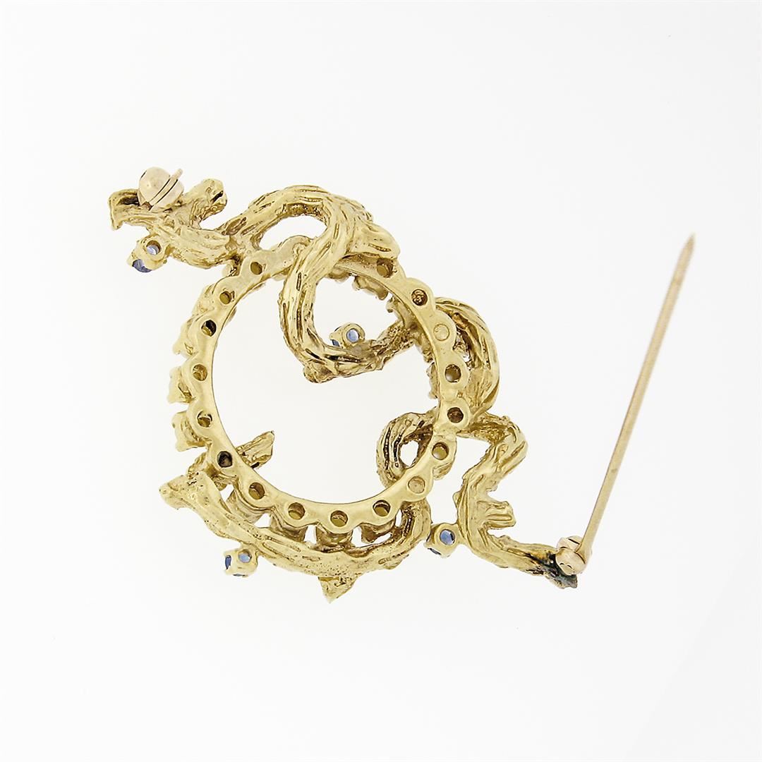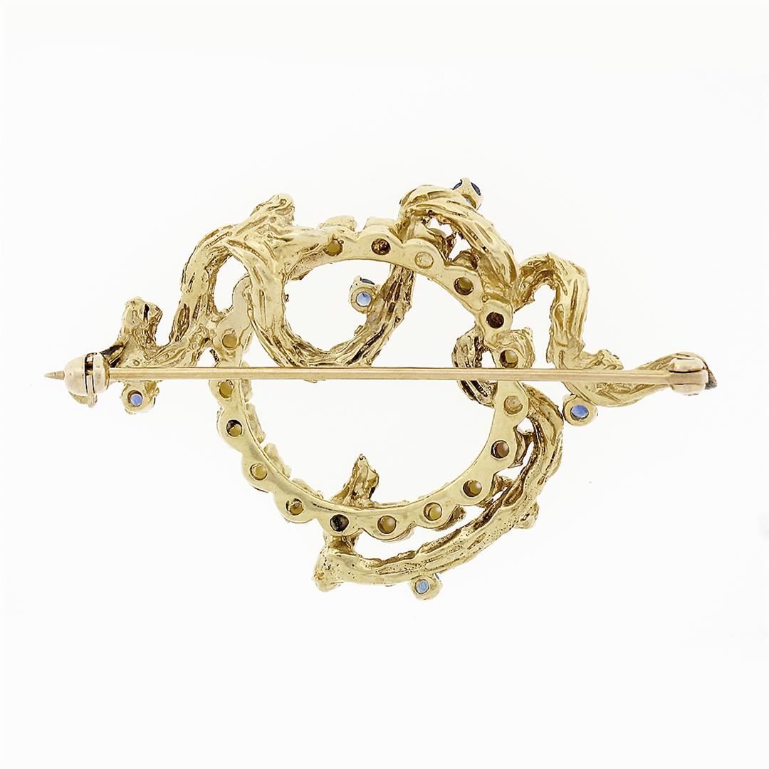 A vintage solid 14k yellow gold vine pin brooch, with 16 round shape natural pearls (2.5-2.7mm), and 5 round brilliant cut natural sapphires (0.15ctw ). Measures 30.4x46.8mm and weighs a total of 11.57 grams.