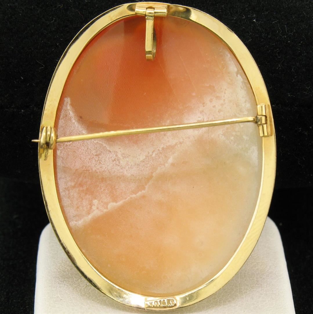 A vintage solid 14k yellow gold brooch or pendant. featuring 1 oval shape carved natural shell cameo (39.5x30.7mm). Measures 42.8x33.1mm and weighs a total of 7.6 grams.