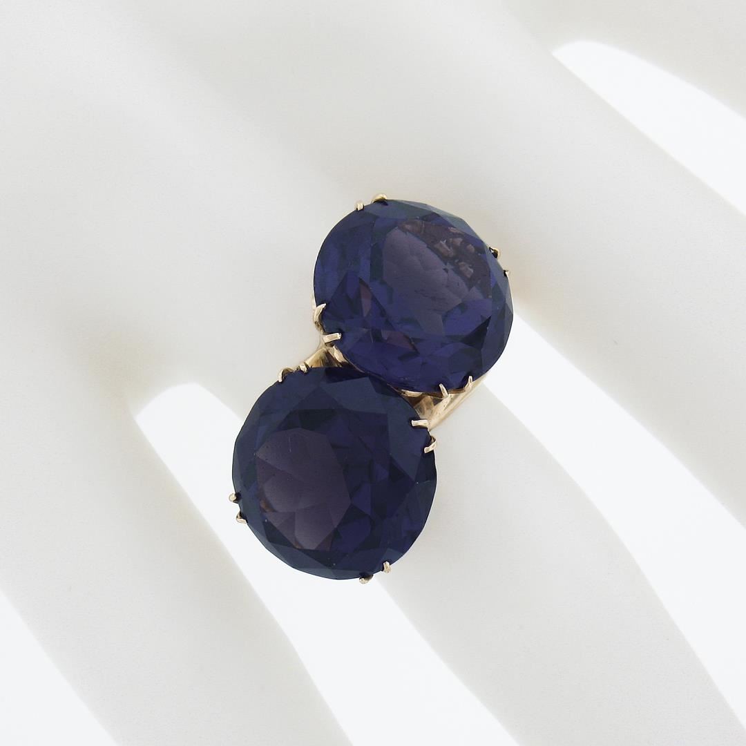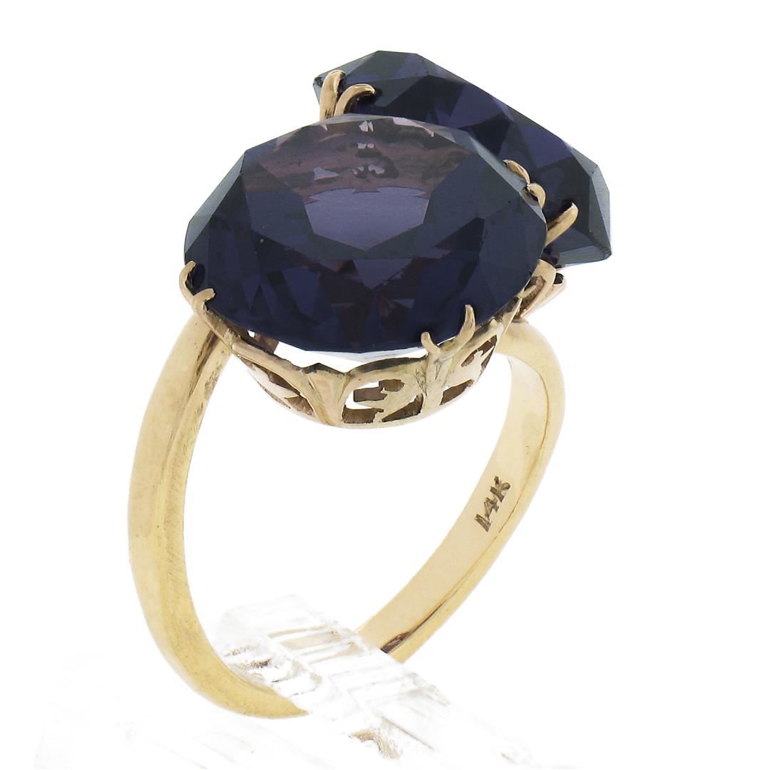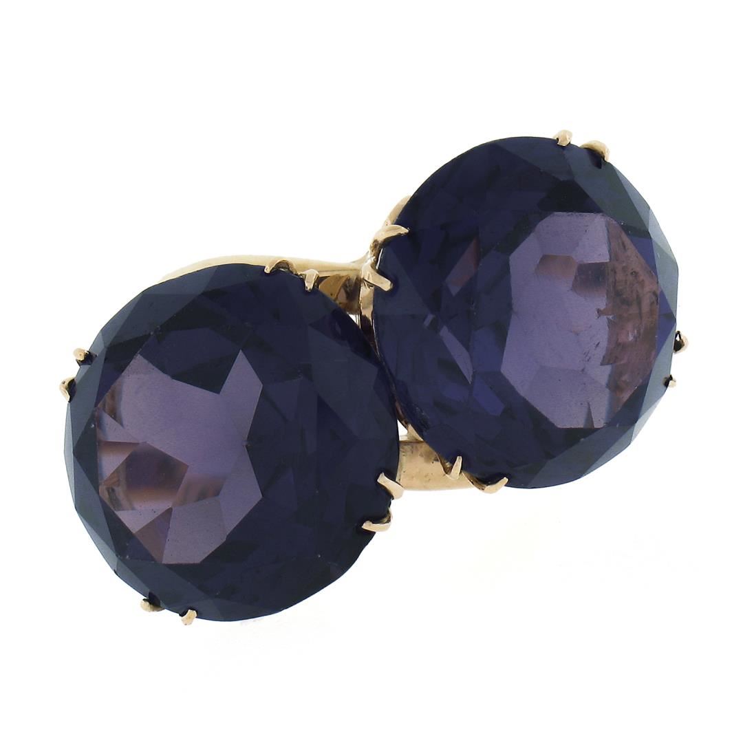 A vintage 14k yellow gold bypass ring, with 2 round cut synthetic alexandrites (13.4mm). The ring is size 6.0, weighs a total of 7.88 grams, and measures 22mm wide.