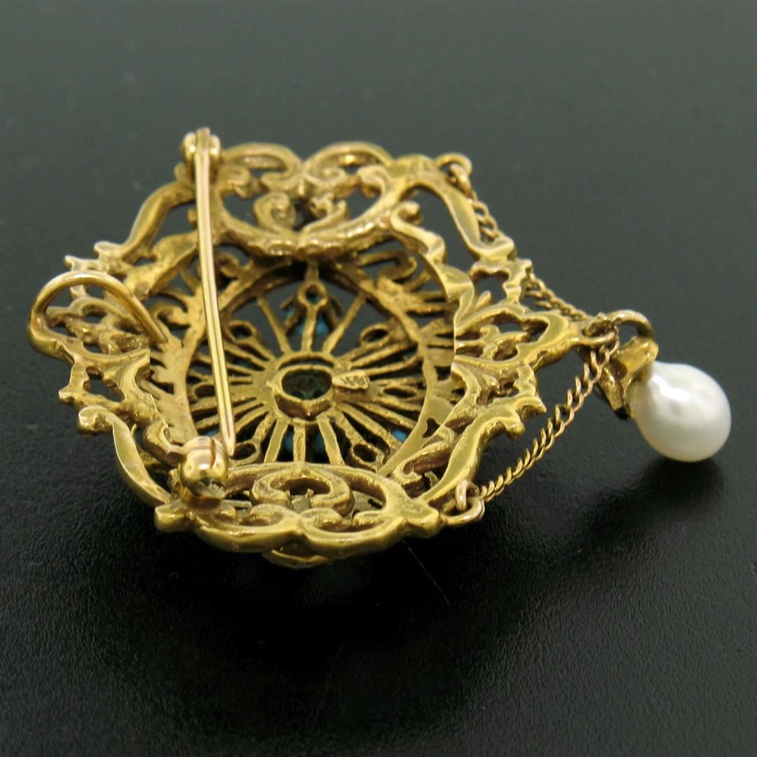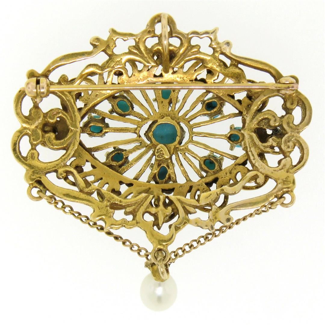 One Vintage 14k Yellow Gold Round Turquoise & Pearl Open Work Brooch Pin Pendant. Item Details: Material: 14K Solid Yellow Gold, Total Weight: 11.7 Grams, Stone(s): (9) Natural Genuine Turquoise - Round Cabochon Cut - Prong Set - Matching Turquoise Color - 2.5 to 4.5mm, (1) Natural Genuine Pearl - Pear Shape - Pure White Color w/ Soft Pink Overtones - 5.31x7.18mm, (1) Natural Genuine Seed Pearl - 1.5mm (approx.), Overall Height: 44.6mm (including the pearl dangle), Overall Width: 41.4mm, Overall Thickness: 8.6mm (not including the pin) Bail Measurements (Inside): 4.18x2.55mm Clasp: Pin Back w/ Rotating Lock Mechanism Condition: Vintage piece. Original patina has been preserved. Excellent overall condition!