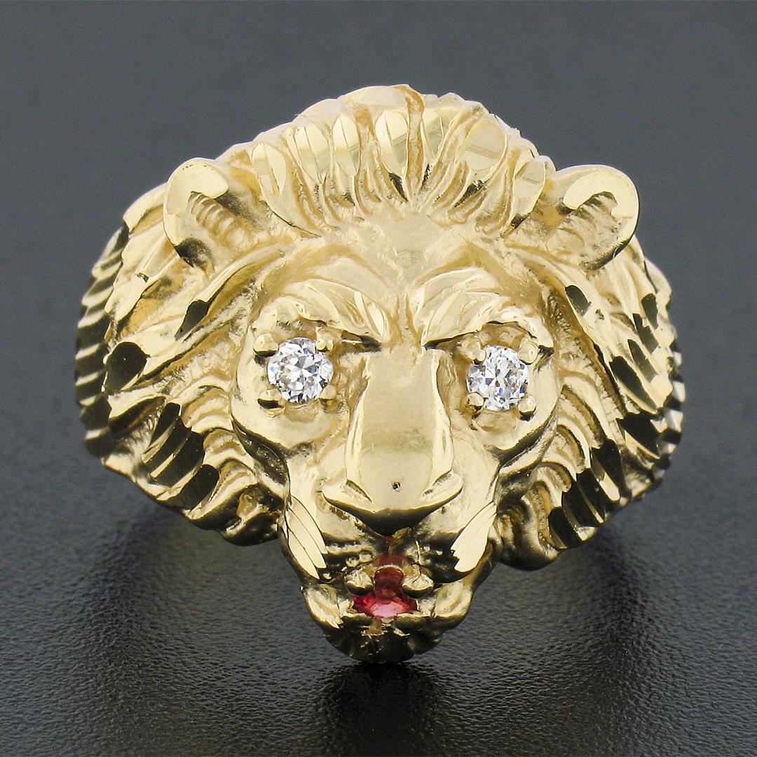 A vintage solid 14k yellow gold lion ring, with 2 old European cut natural diamonds (G - VS1; 0.08ctw), and 1 round brilliant cut natural ruby (0.05ct). The ring is size 8.0, weighs a total of 11.42 grams, and measures 20mm wide.