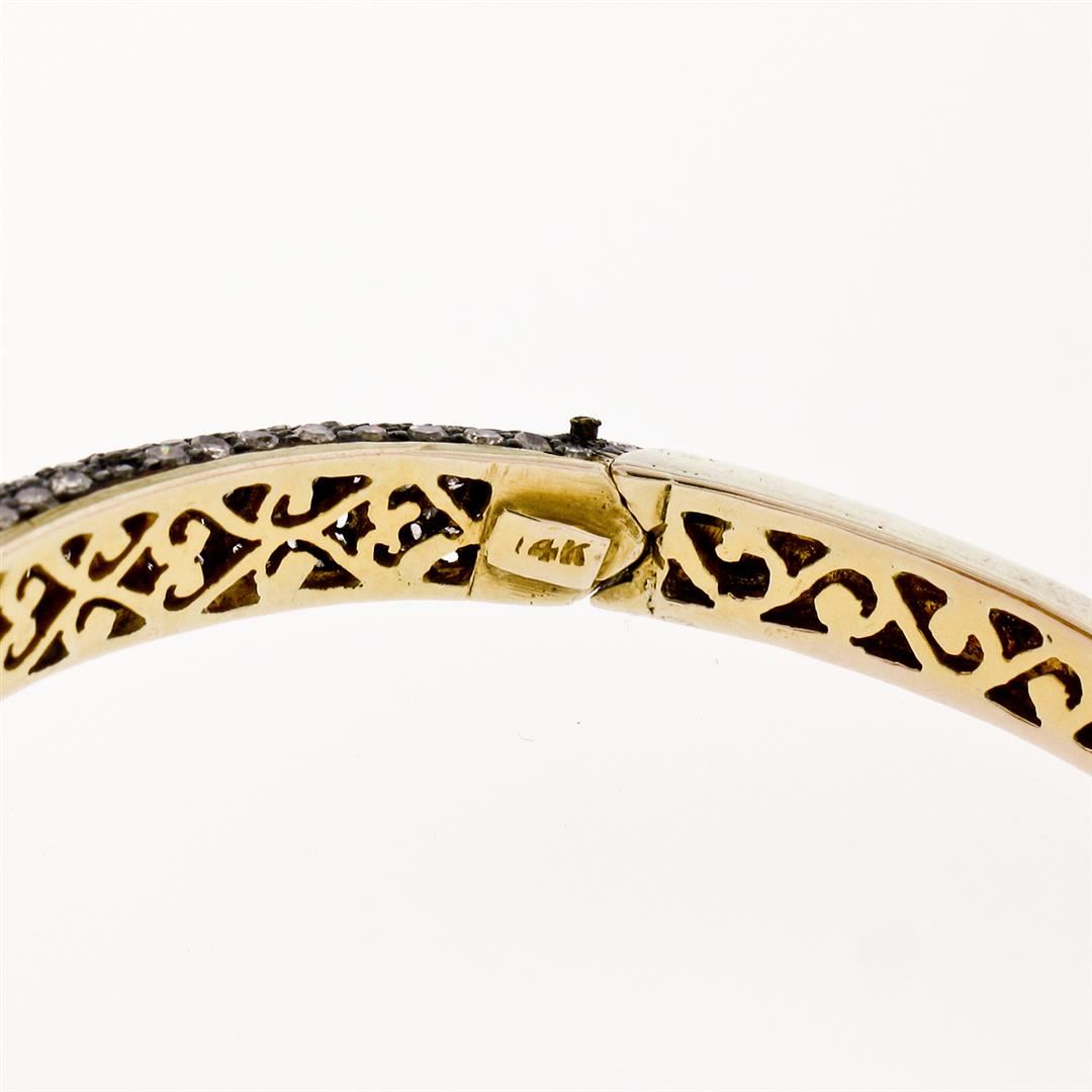 A vintage solie 14k yellow gold open bangle bracelet, featuring 1 oval cut natural synthetic ruby (40.50x24.45mm - 42.00ct), surrounded with numerous of round brilliant cut natural diamonds (Light Champagne- SI2/I2; 4.00ctw ). It weighs a total of 36.25 grams, measures 67.7mm wide, and measures 6.5 inches in length.