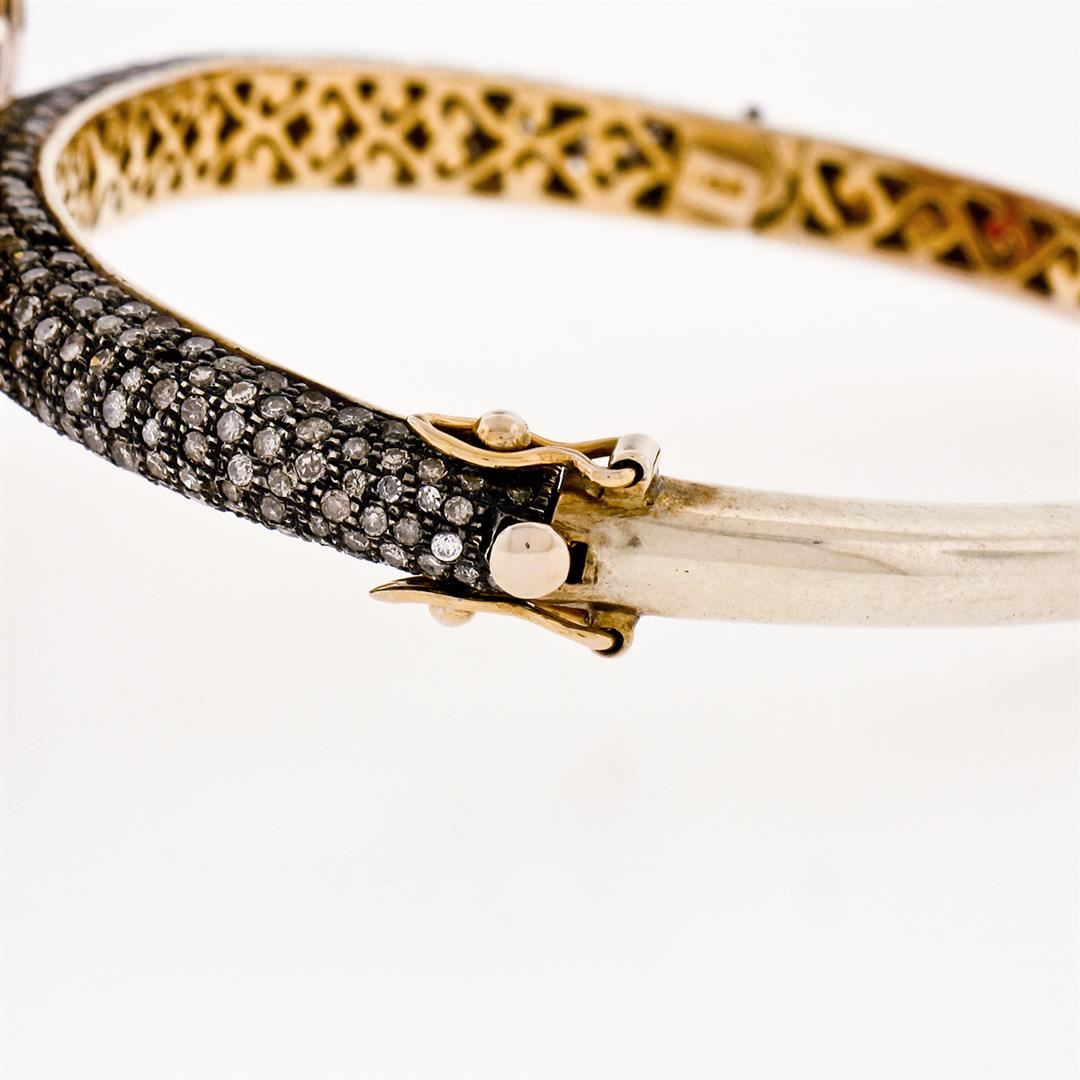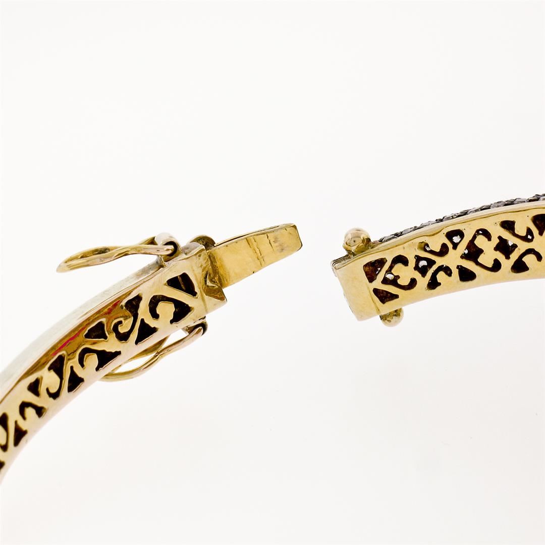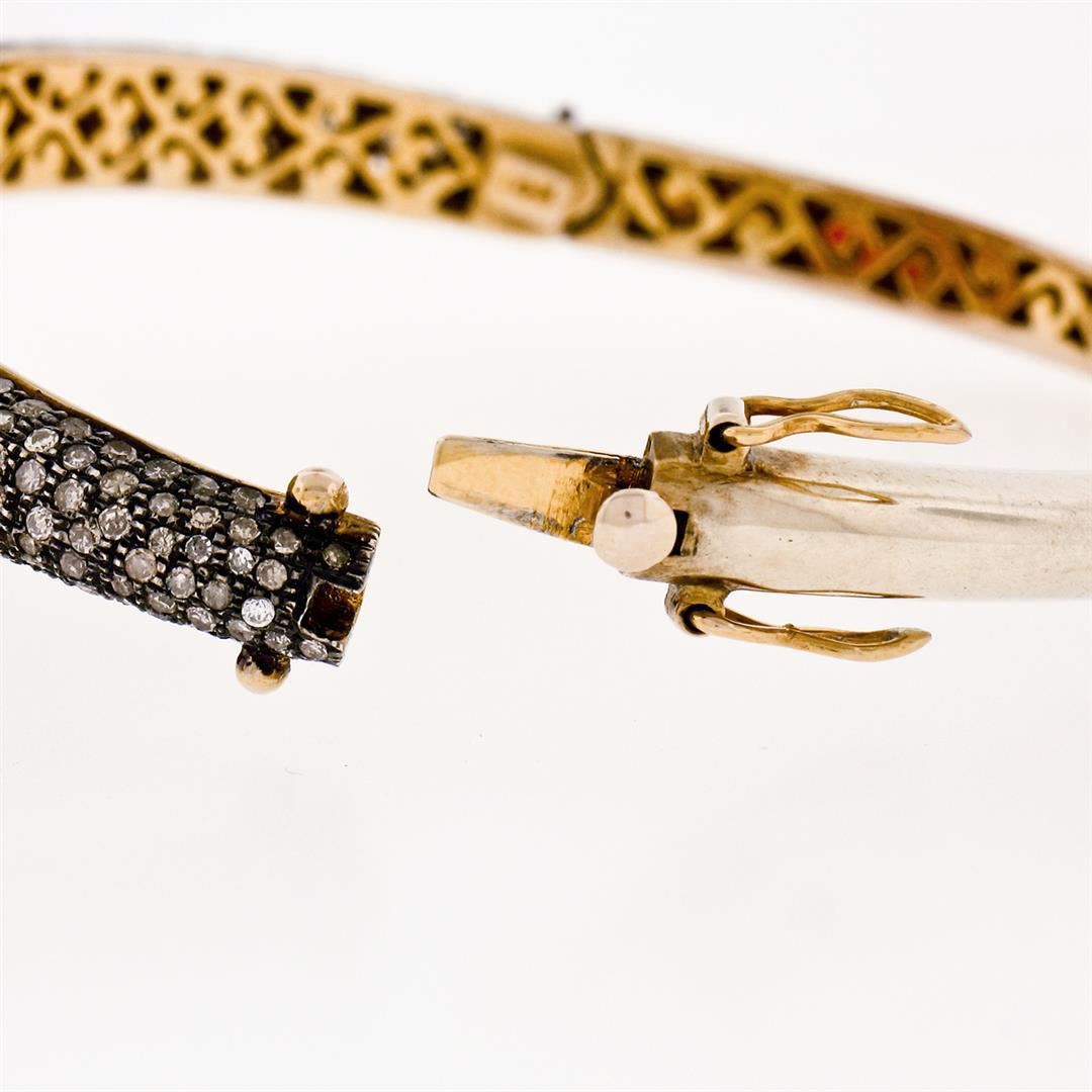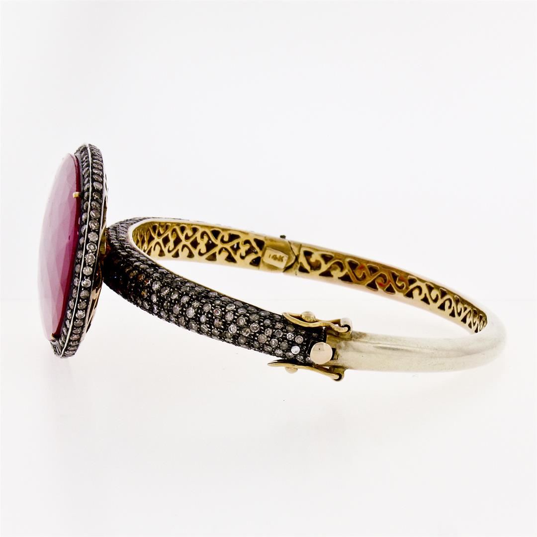 A vintage solie 14k yellow gold open bangle bracelet, featuring 1 oval cut natural synthetic ruby (40.50x24.45mm - 42.00ct), surrounded with numerous of round brilliant cut natural diamonds (Light Champagne- SI2/I2; 4.00ctw ). It weighs a total of 36.25 grams, measures 67.7mm wide, and measures 6.5 inches in length.