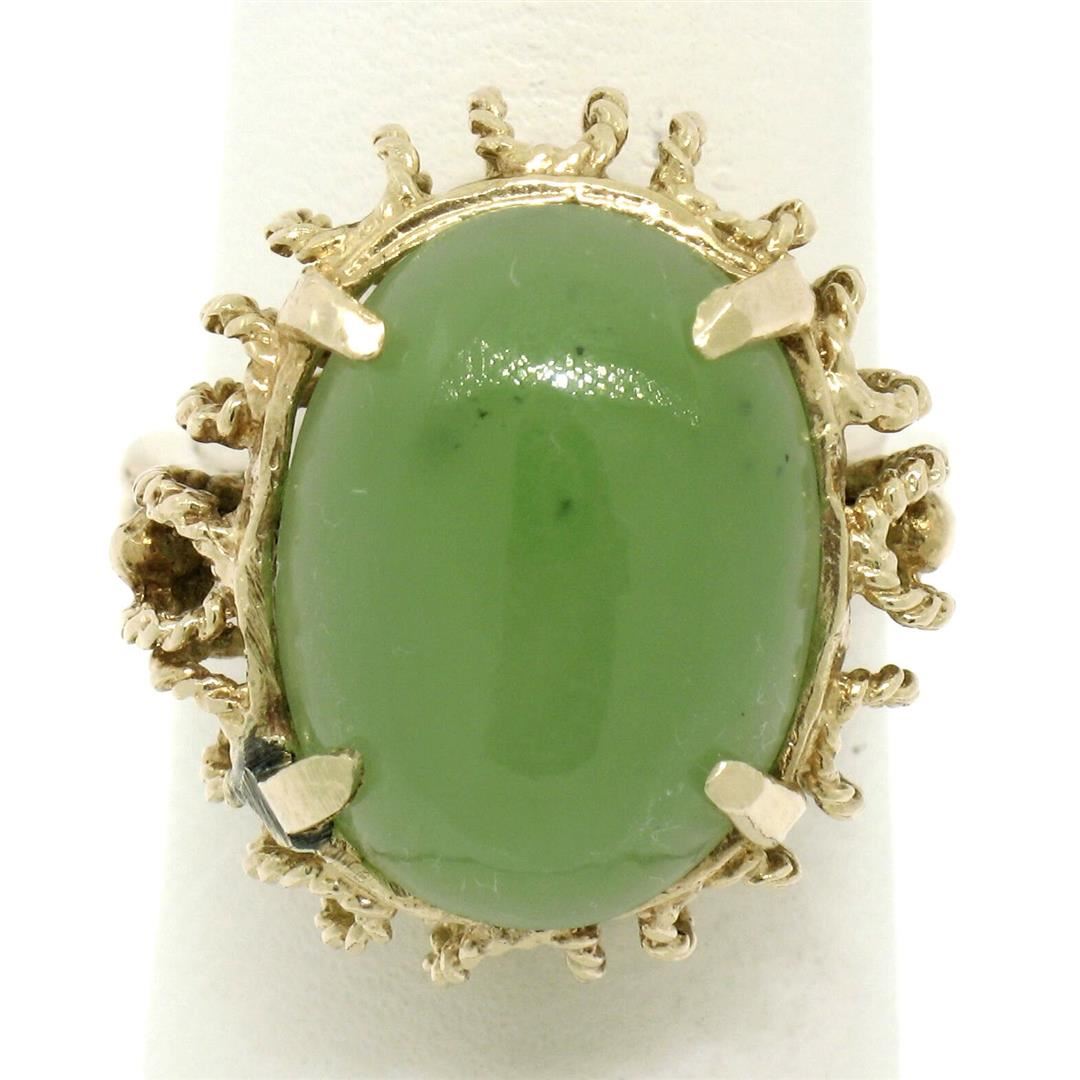 A vintage solid 14k yellow gold solitaire statement ring, with 1 oval cabochon cut natural jade (16.2x11.8mm ). The ring is size 5.5, weighs a total of 6.10 grams, and measures 20.20mm wide.