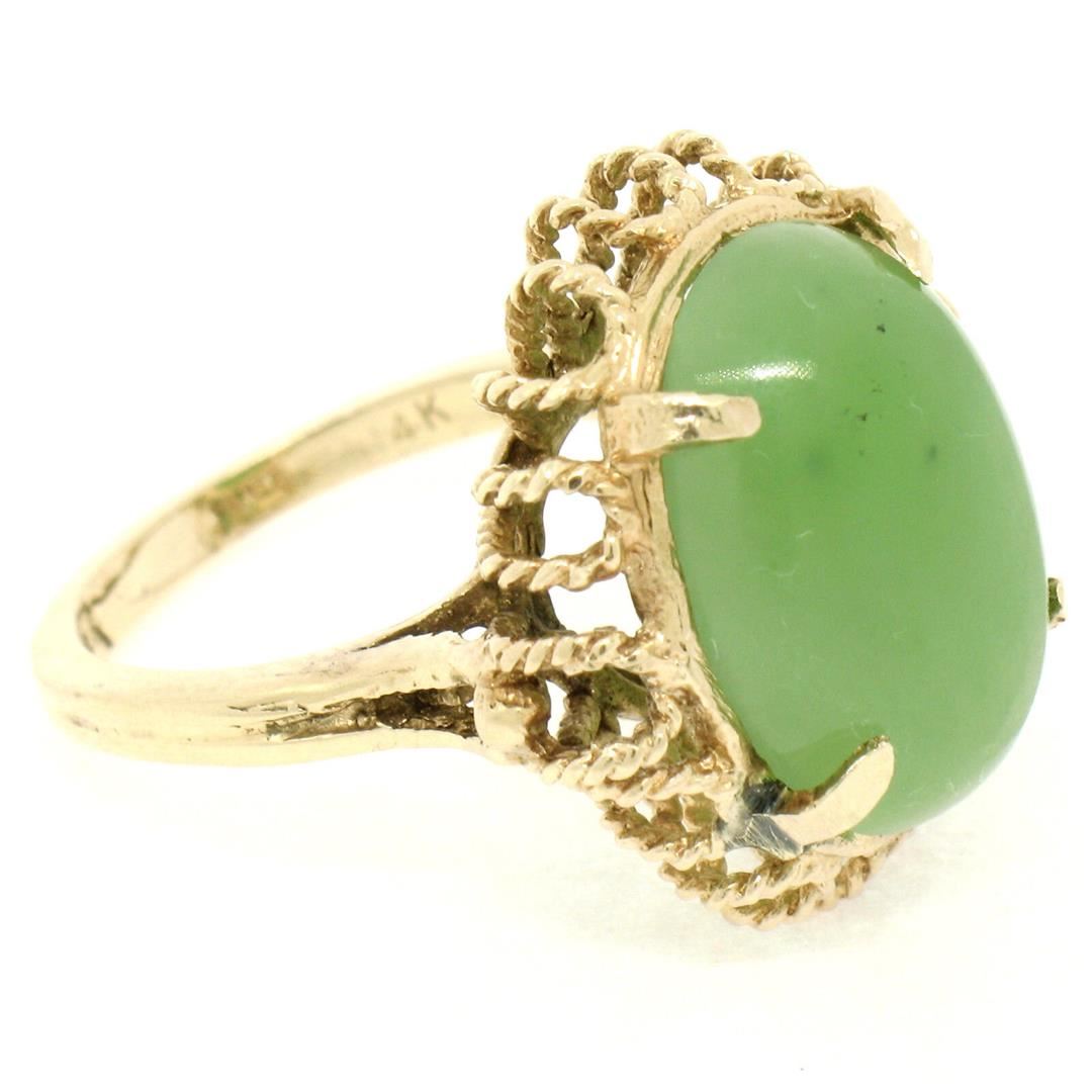 A vintage solid 14k yellow gold solitaire statement ring, with 1 oval cabochon cut natural jade (16.2x11.8mm ). The ring is size 5.5, weighs a total of 6.10 grams, and measures 20.20mm wide.