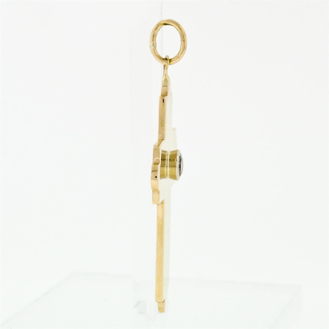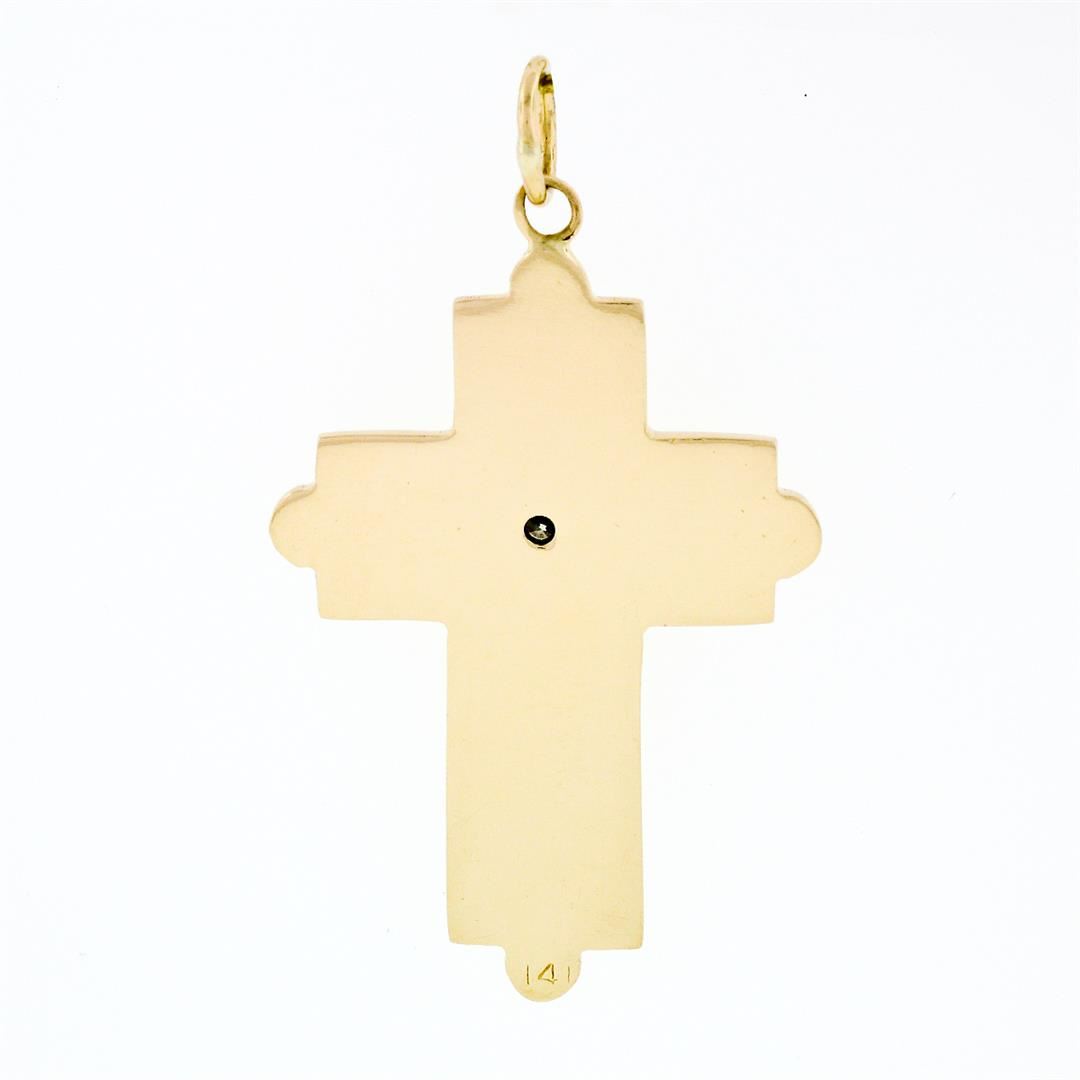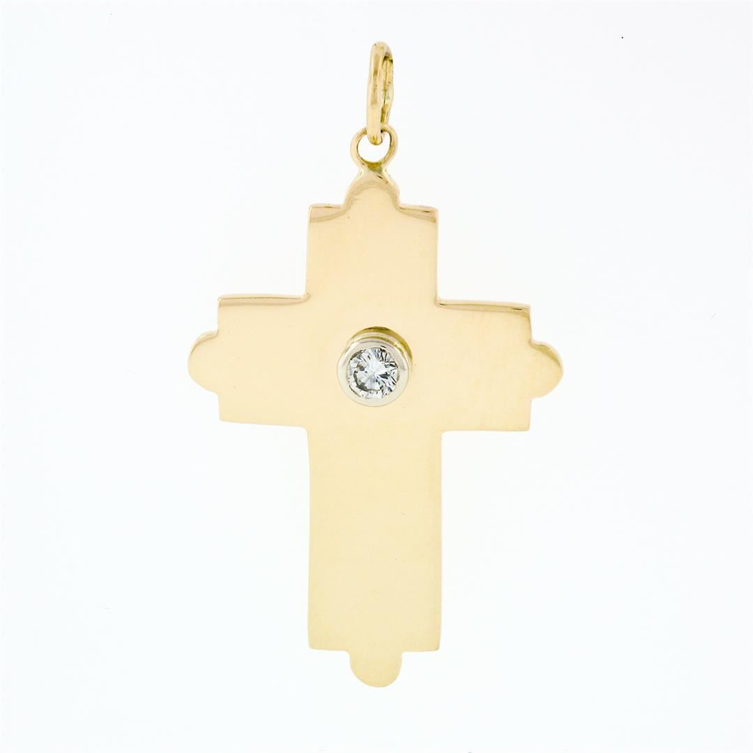 A vintage solid 14k yellow gold cross pendant, with 1 old transitional cut natural diamond (G - VS1 ; 0.15ct). The pendant weighs a total of 3.65 grams, measures 36.90x20.70mm including the bail, and the inside of the bail measures 3.70x3.0mm.