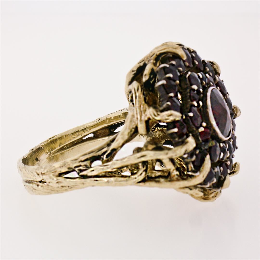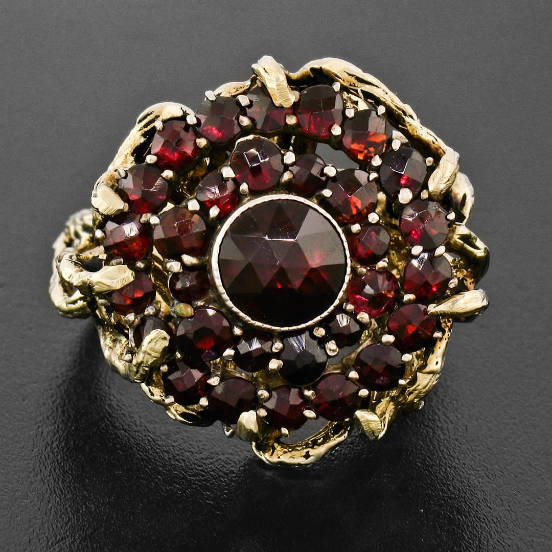 A vintage 14k yellow gold cluster ring featuring a 7.4mm round garnet set at its center in a sterling silver-topped bezel among 30 additional round cut garnets. The ring is size 7.5, weighs a total of 16.18 grams, and measures 23.85mm wide.
