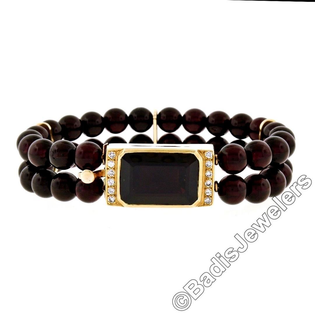 A vintage, dual strand, 44 round garnet bead bracelet crafted from 14kt yellow gold featuring a large 12.50ct emerald cut garnet and 0.24ctw round brilliant diamond (F/G - VS1/VS2) centerpiece. It weighs a total of 49.53 grams, measures 13.65mm wide, and will comfortably fit up to a 6.5 inch wrist.