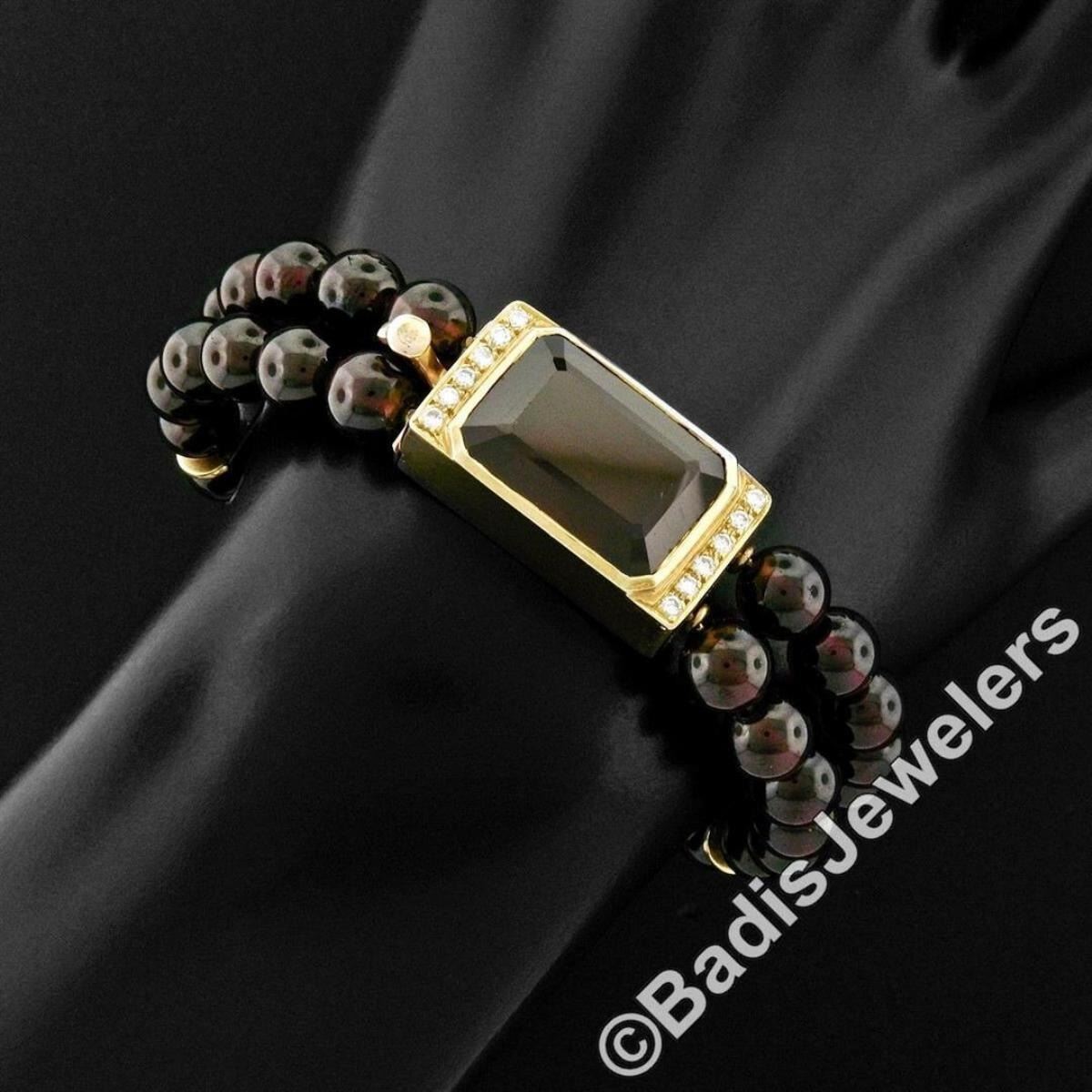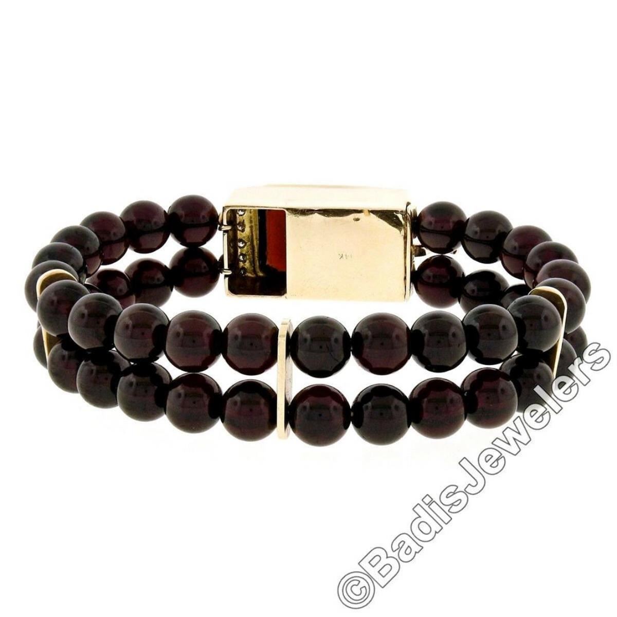 A vintage, dual strand, 44 round garnet bead bracelet crafted from 14kt yellow gold featuring a large 12.50 ct emerald cut garnet and 0.24ctw round brilliant diamond (F/G - VS1/VS2) centerpiece. It weighs a total of 49.53 grams, measures 13.65mm wide, and will comfortably fit up to a 6.5 inch wrist.