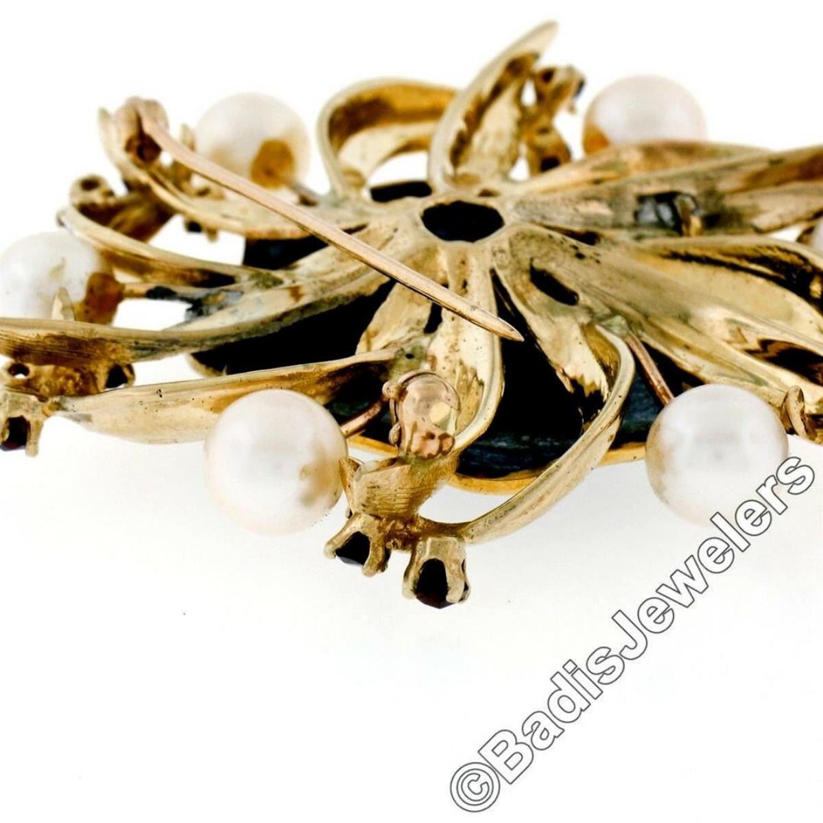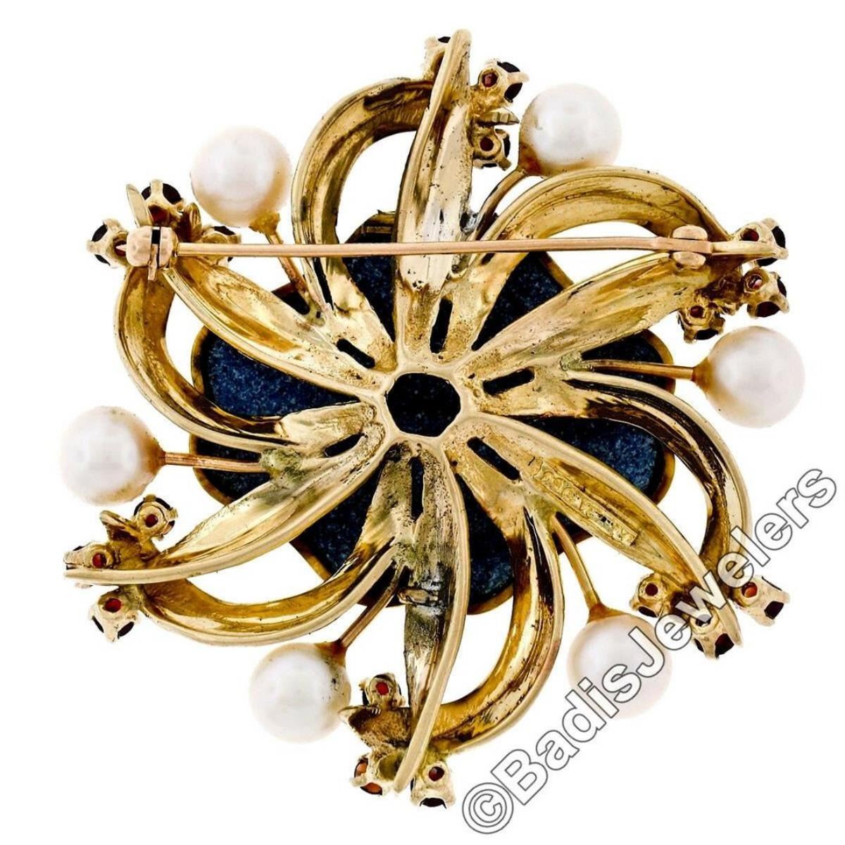 A vintage 14kt yellow gold pendant or brooch featuring a hand-painted portrait surrounded by 6 round cultured pearls (6.50 to 6.75mm) and 18 round rose cut garnets (1.80ctw). The pendant weighs a total of 18.07 grams and measures 50.10x47.75mm including the bail.