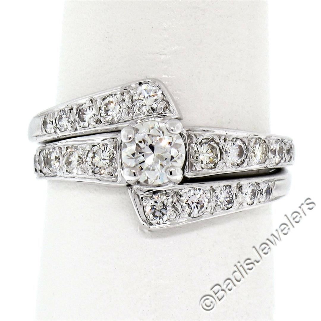 A vintage 14kt white gold nesting engagement ring and wedding band with a 0.40ct round transitional cut diamond (G - VS2) solitaire accented by 0.66ctw round brilliant diamonds (F/G - VS1/VS2). The ring is size 6.5, weighs a total of 4.63 grams, and measures 11.15mm wide.