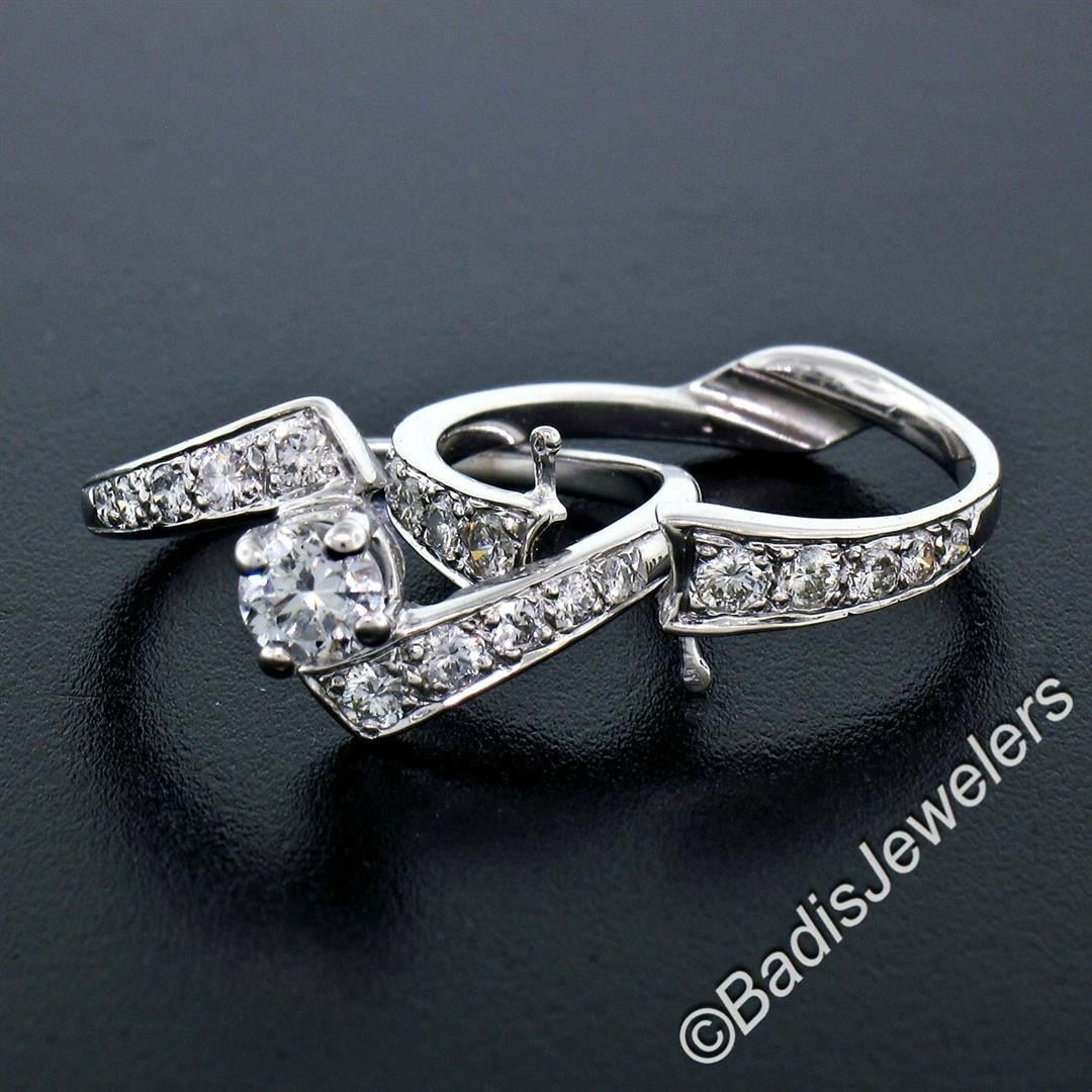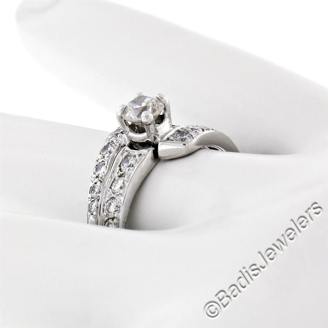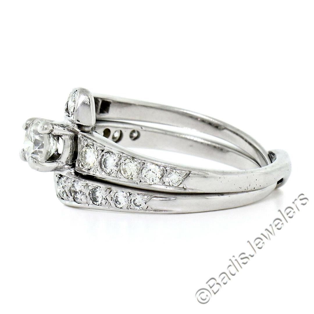 A vintage 14kt white gold nesting engagement ring and wedding band with a 0.40ct round transitional cut diamond (G - VS2) solitaire accented by 0.66ctw round brilliant diamonds (F/G - VS1/VS2). The ring is size 6.5, weighs a total of 4.63 grams, and measures 11.15mm wide.