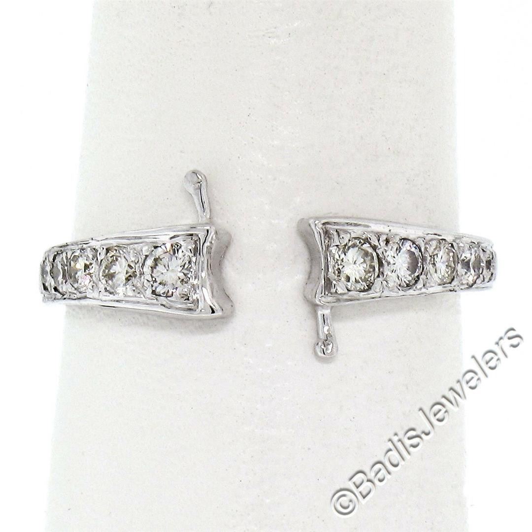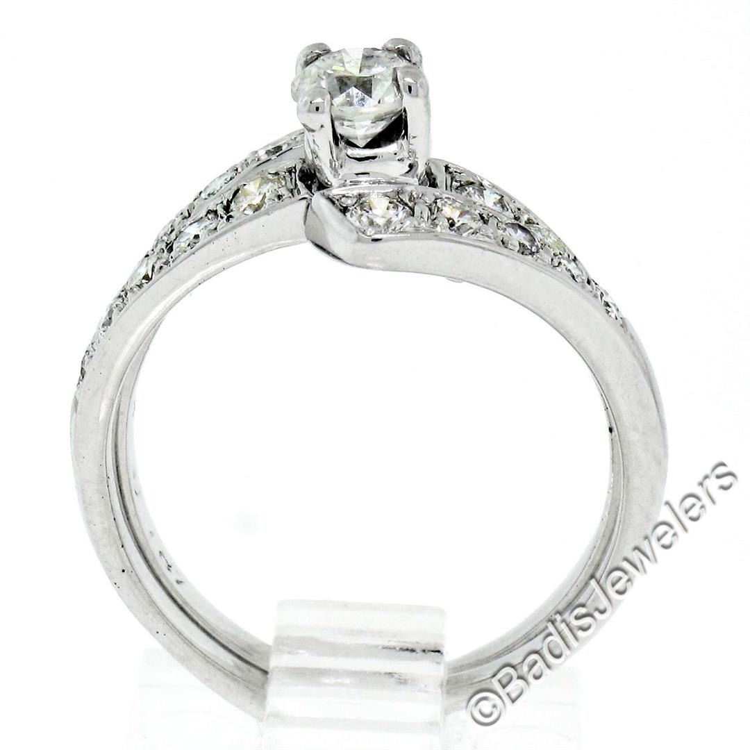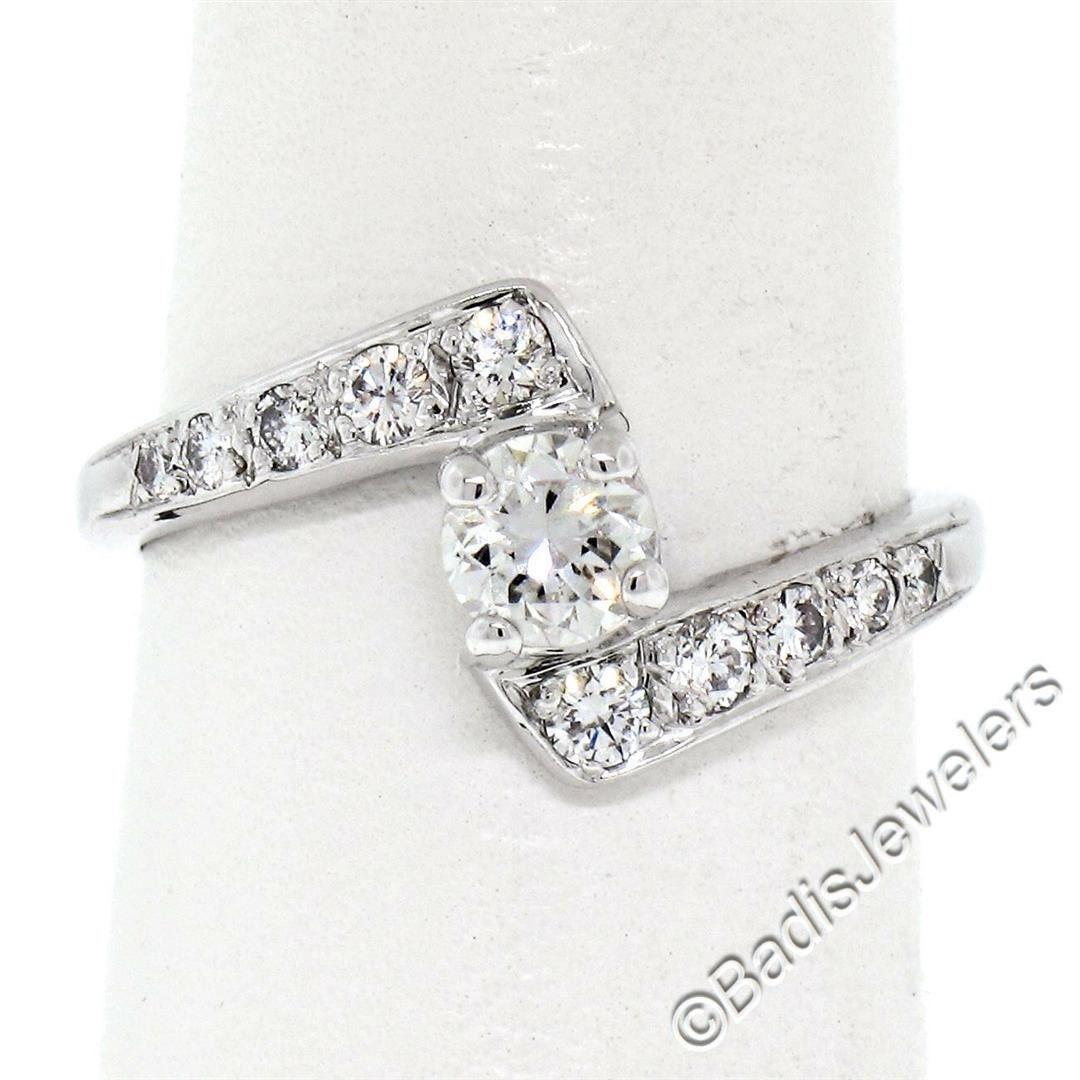 A vintage 14kt white gold nesting engagement ring and wedding band with a 0.40ct round transitional cut diamond (G - VS2) solitaire accented by 0.66ctw round brilliant diamonds (F/G - VS1/VS2). The ring is size 6.5, weighs a total of 4.63 grams, and measures 11.15mm wide.
