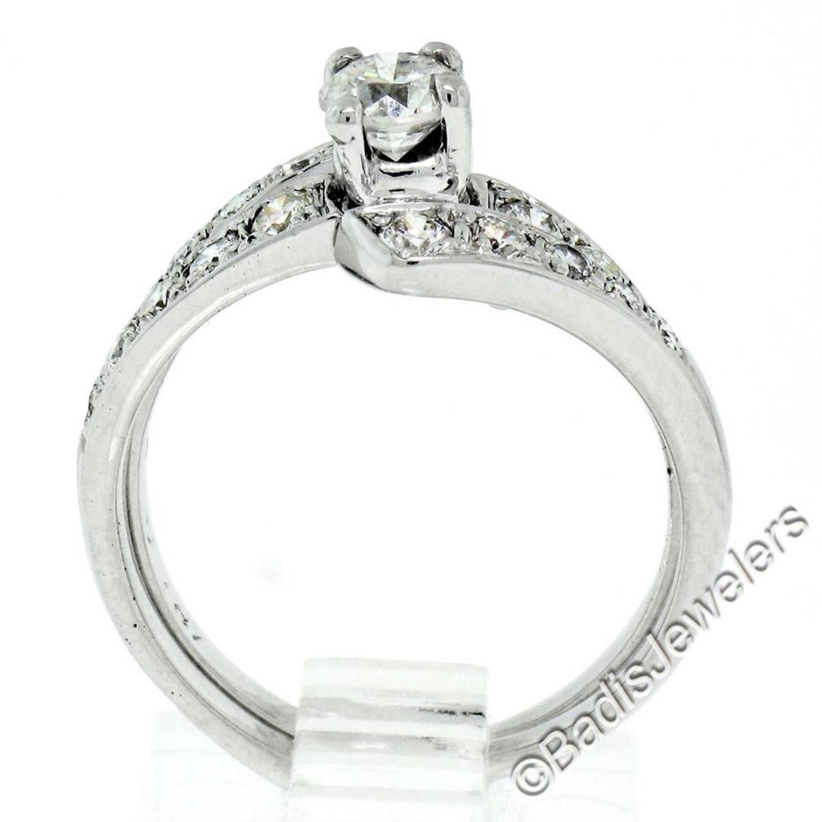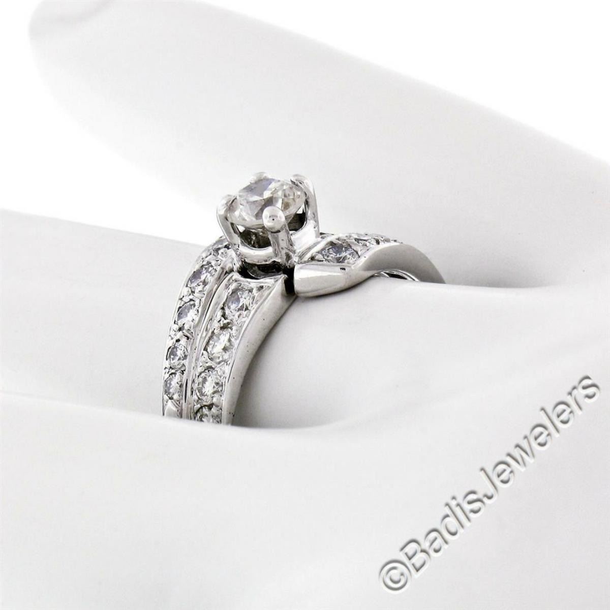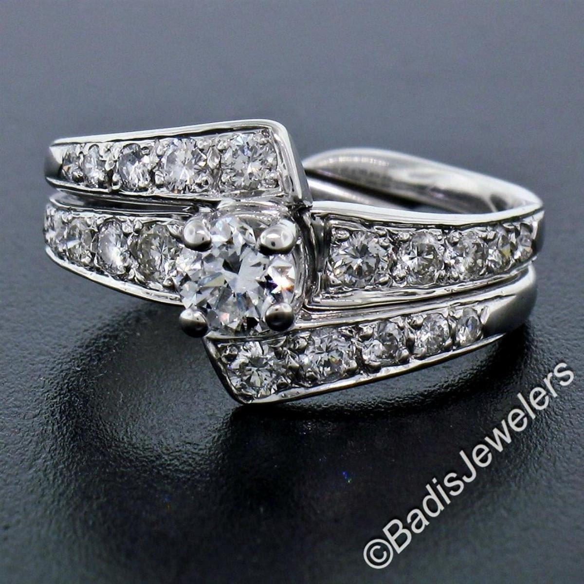 A vintage 14kt white gold nesting engagement ring and wedding band with a 0.40 ct round transitional cut diamond (G - VS2) solitaire accented by 0.66ctw round brilliant diamonds (F/G - VS1/VS2). The ring is size 6.5, weighs a total of 4.63 grams, and measures 11.15mm wide.