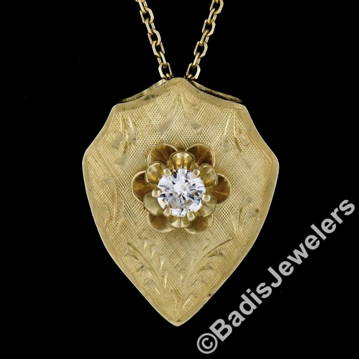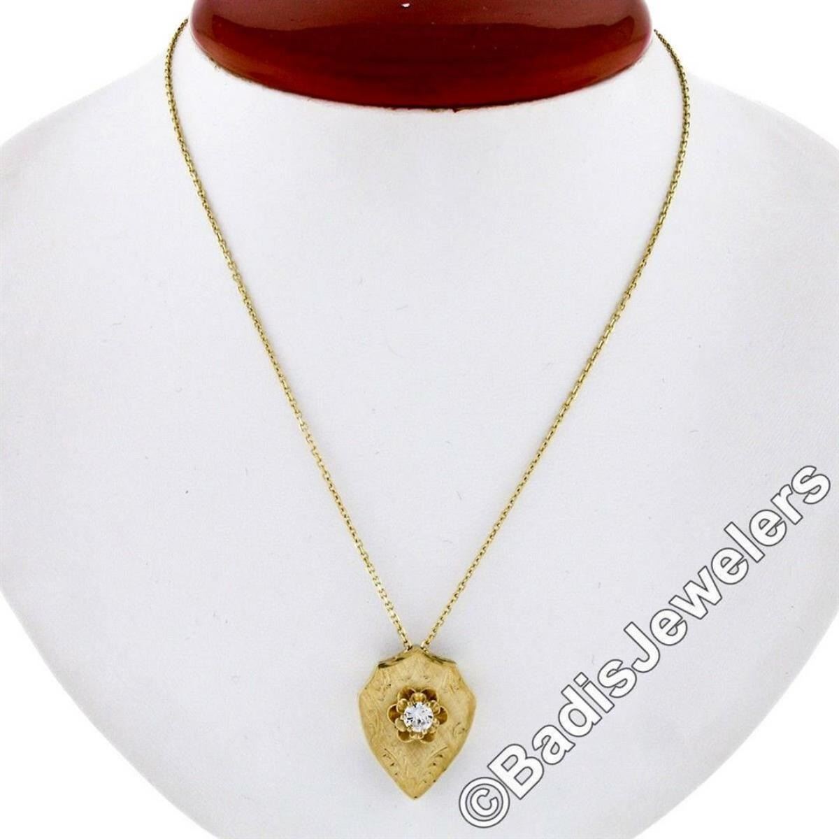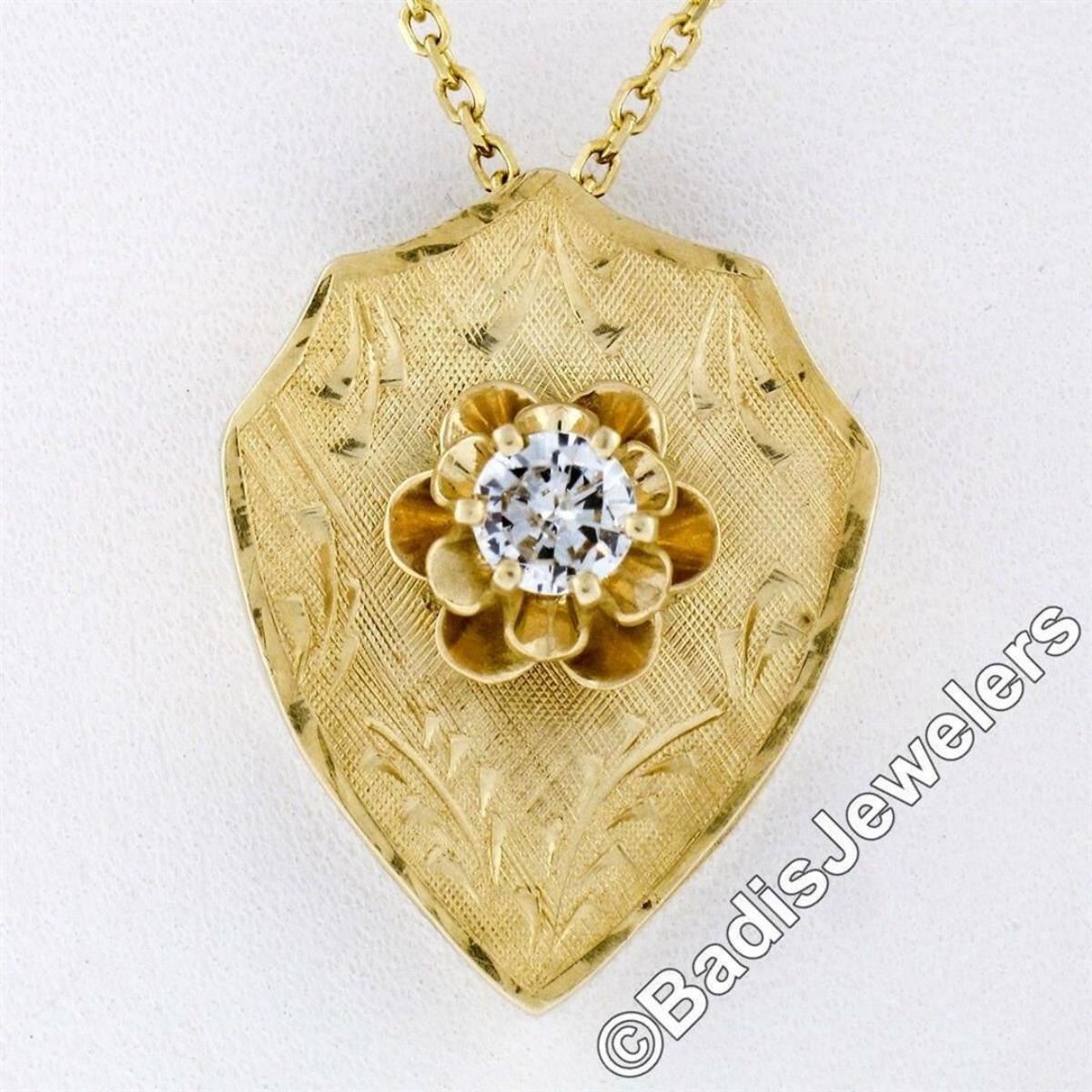 A vintage 14kt yellow gold necklace featuring a hand-etched reversible shield pendant that is topped with a 0.40ct round transitional cut diamond (F - SI1) 6-prong set above a dual flower motif. 18 inch cable link chain, 7.76 grams total weight, pendant measures 12.15x9.50mm.