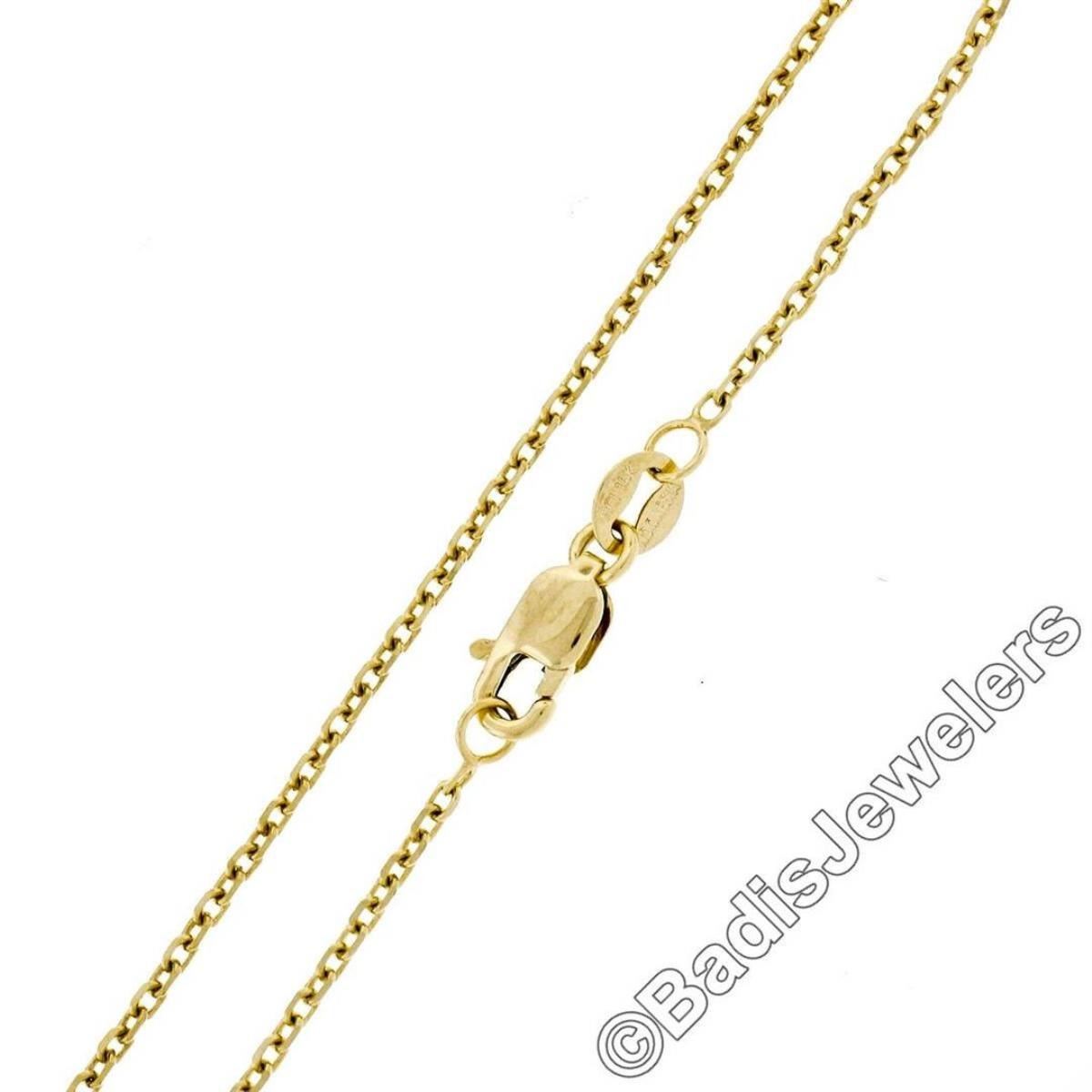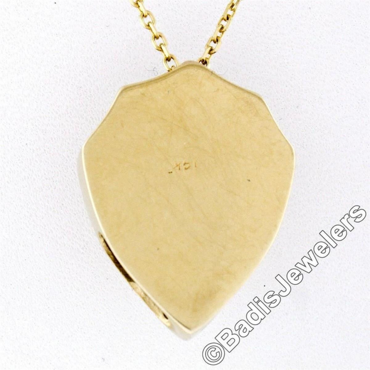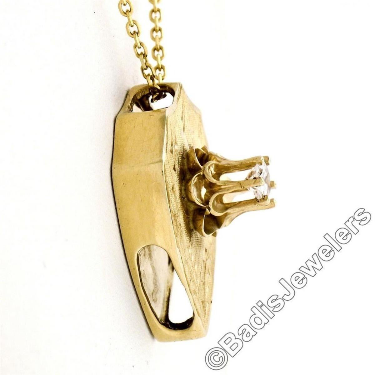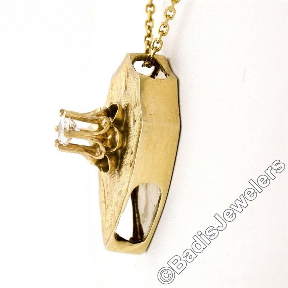A vintage 14kt yellow gold necklace featuring a hand-etched reversible shield pendant that is topped with a 0.40ct round transitional cut diamond (F - SI1) 6-prong set above a dual flower motif. 18 inch cable link chain, 7.76 grams total weight, pendant measures 12.15x9.50mm.