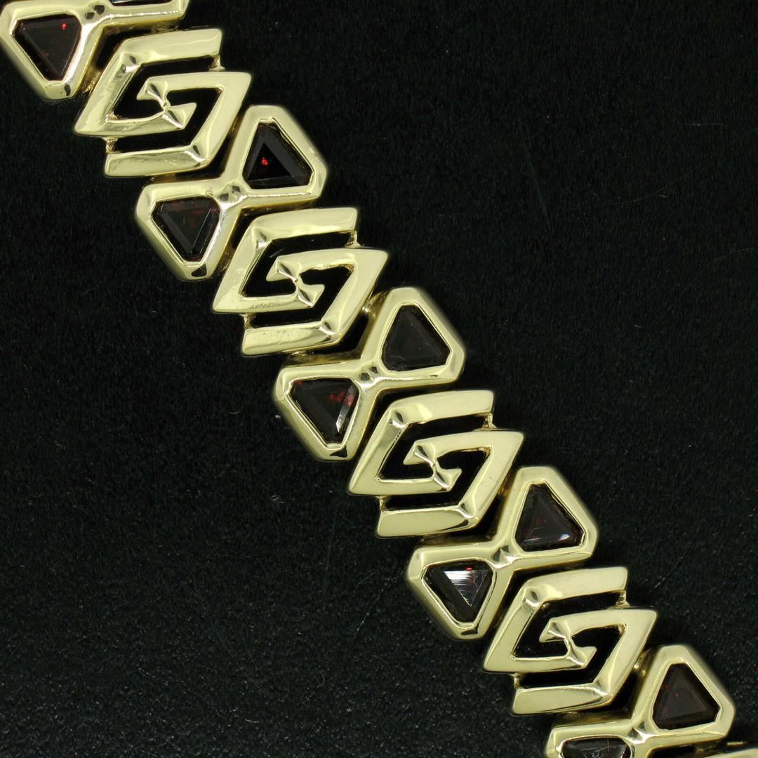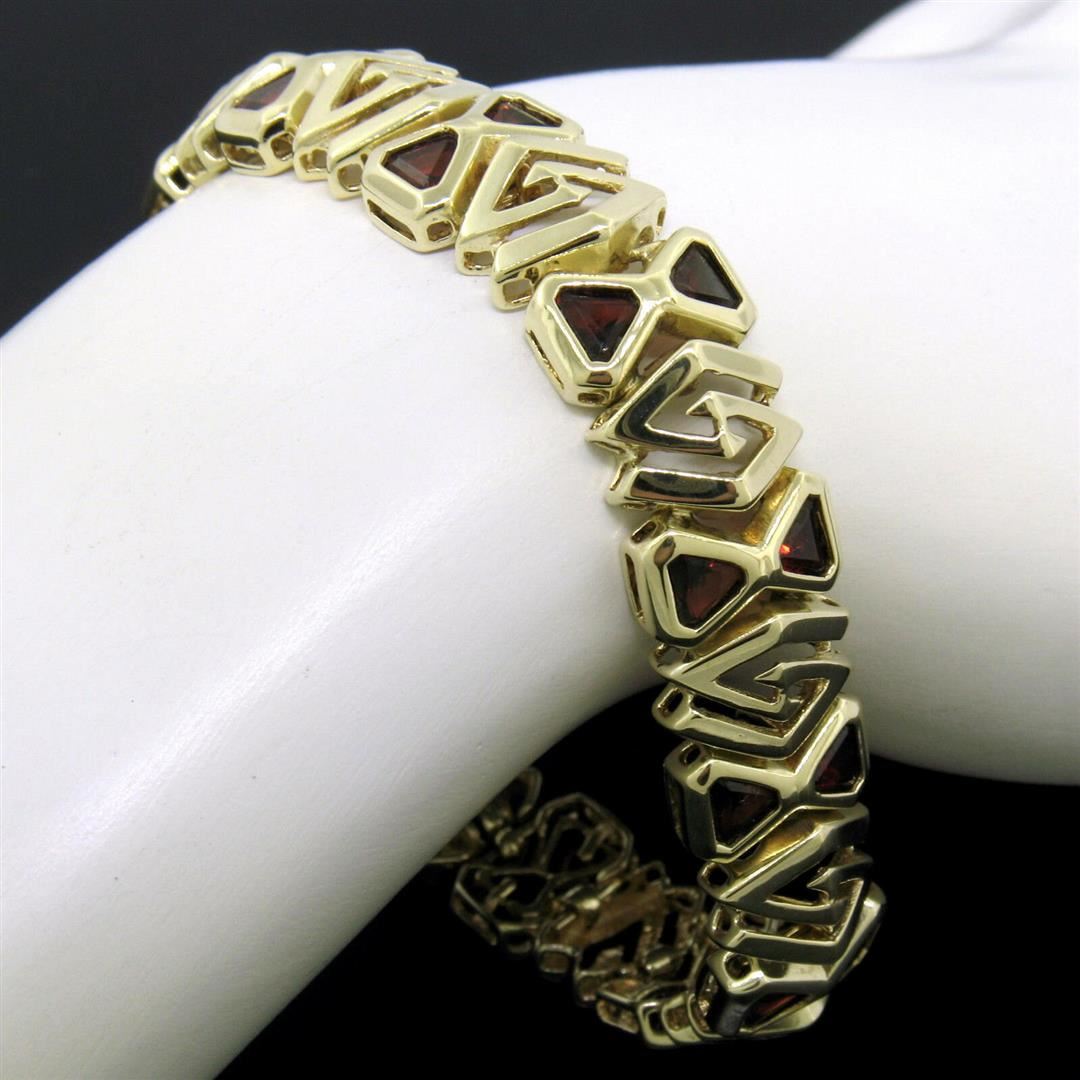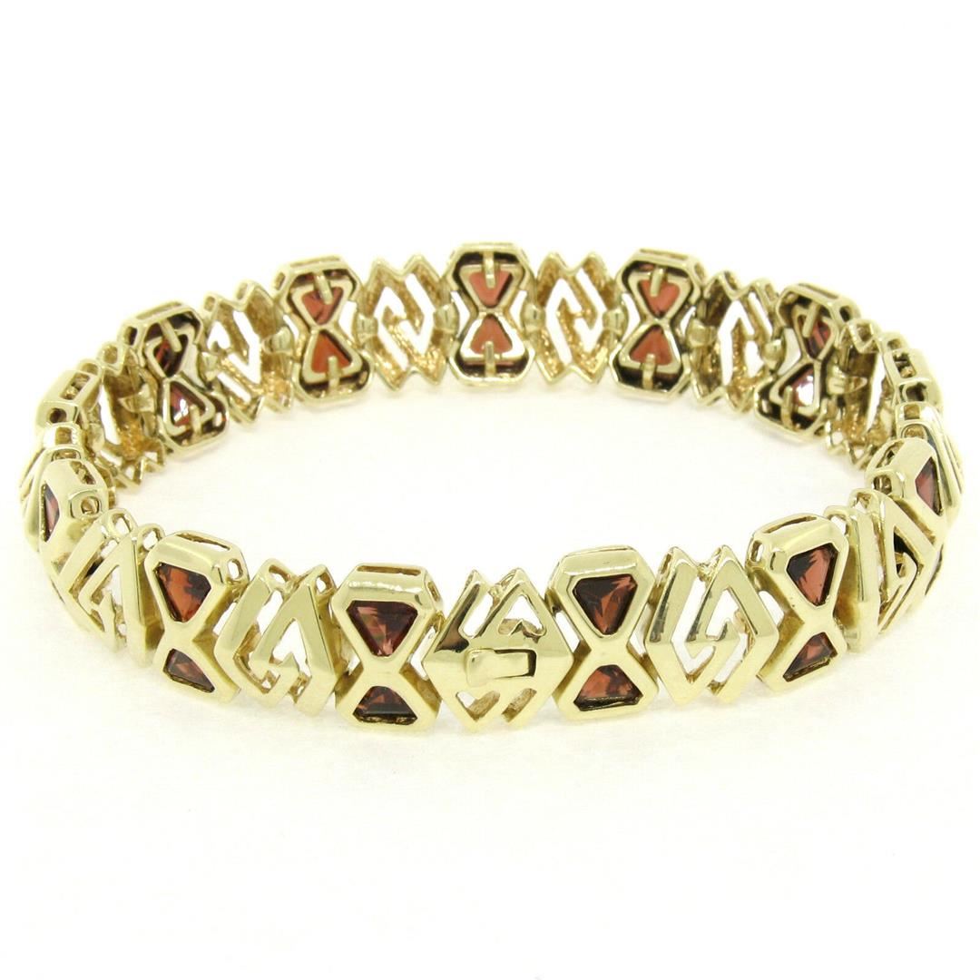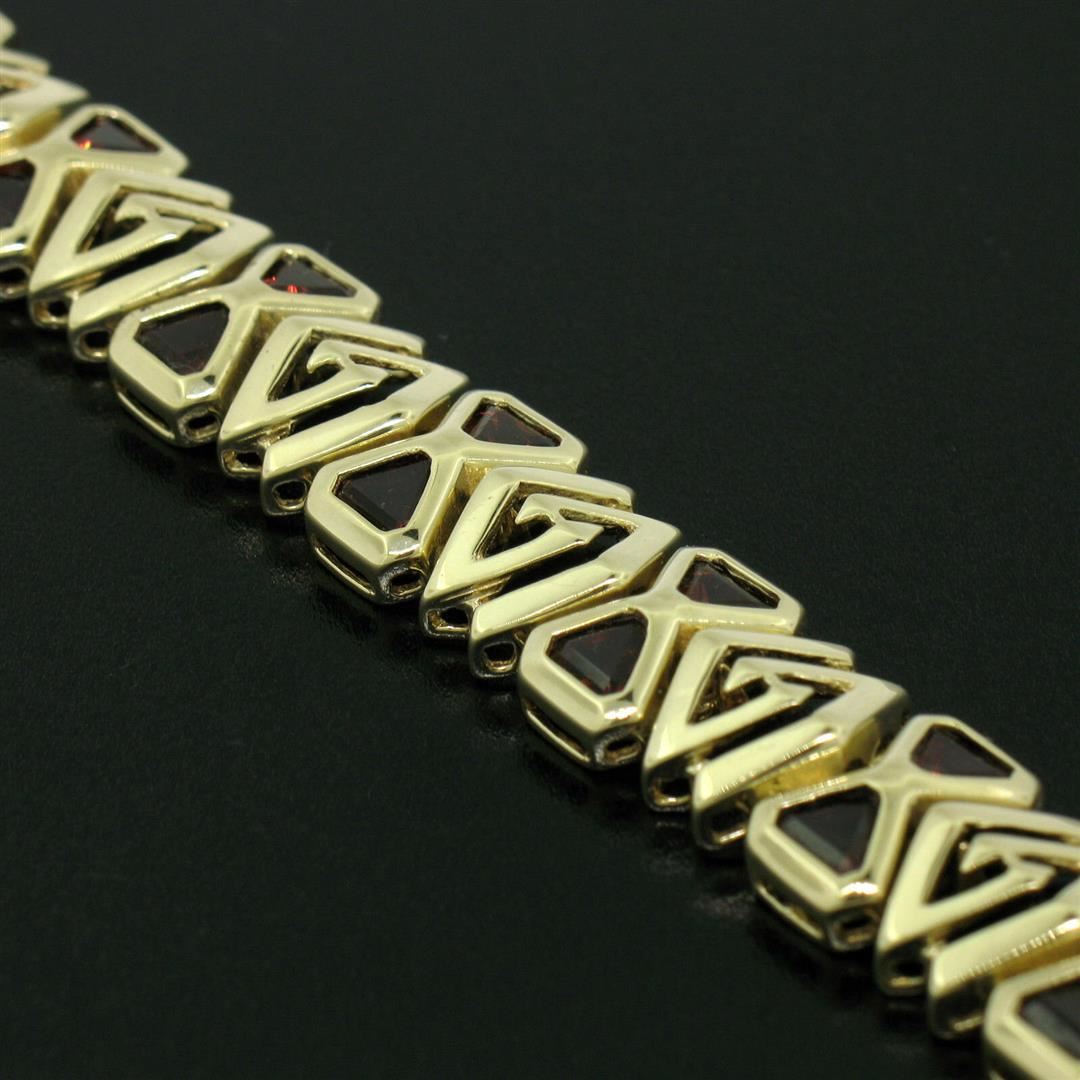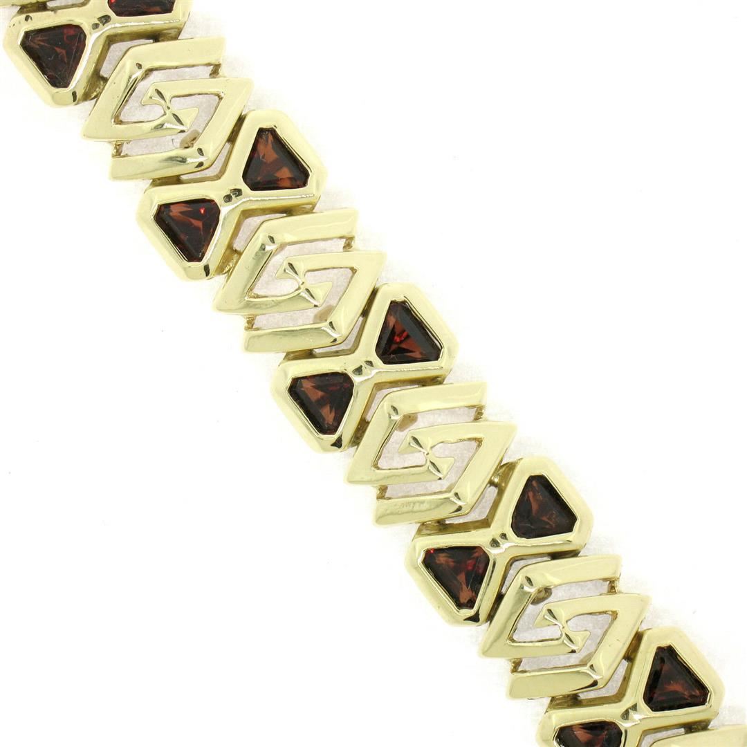 An excellent condition vintage 14kt yellow gold bracelet with 3.12ctw of trillion cut garnets. It weighs a total of 30.98 grams, measures 12.25mm wide, and measures 7 inches in length.