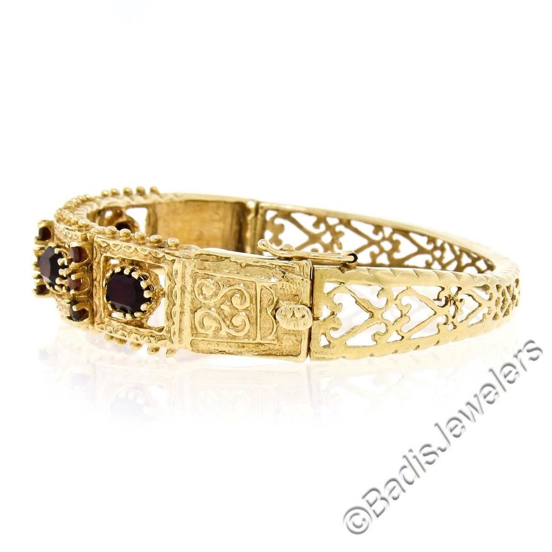 A vintage 14kt yellow gold bangle bracelet with 4.50ctw of oval and round garnets. It weighs a total of 25.08 grams and comfortably fits up to a 6.5 inch wrist.
