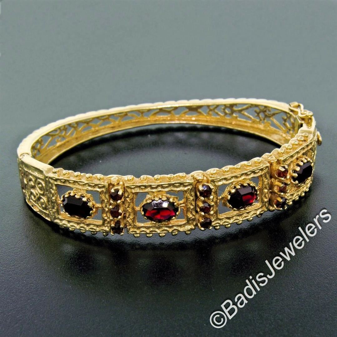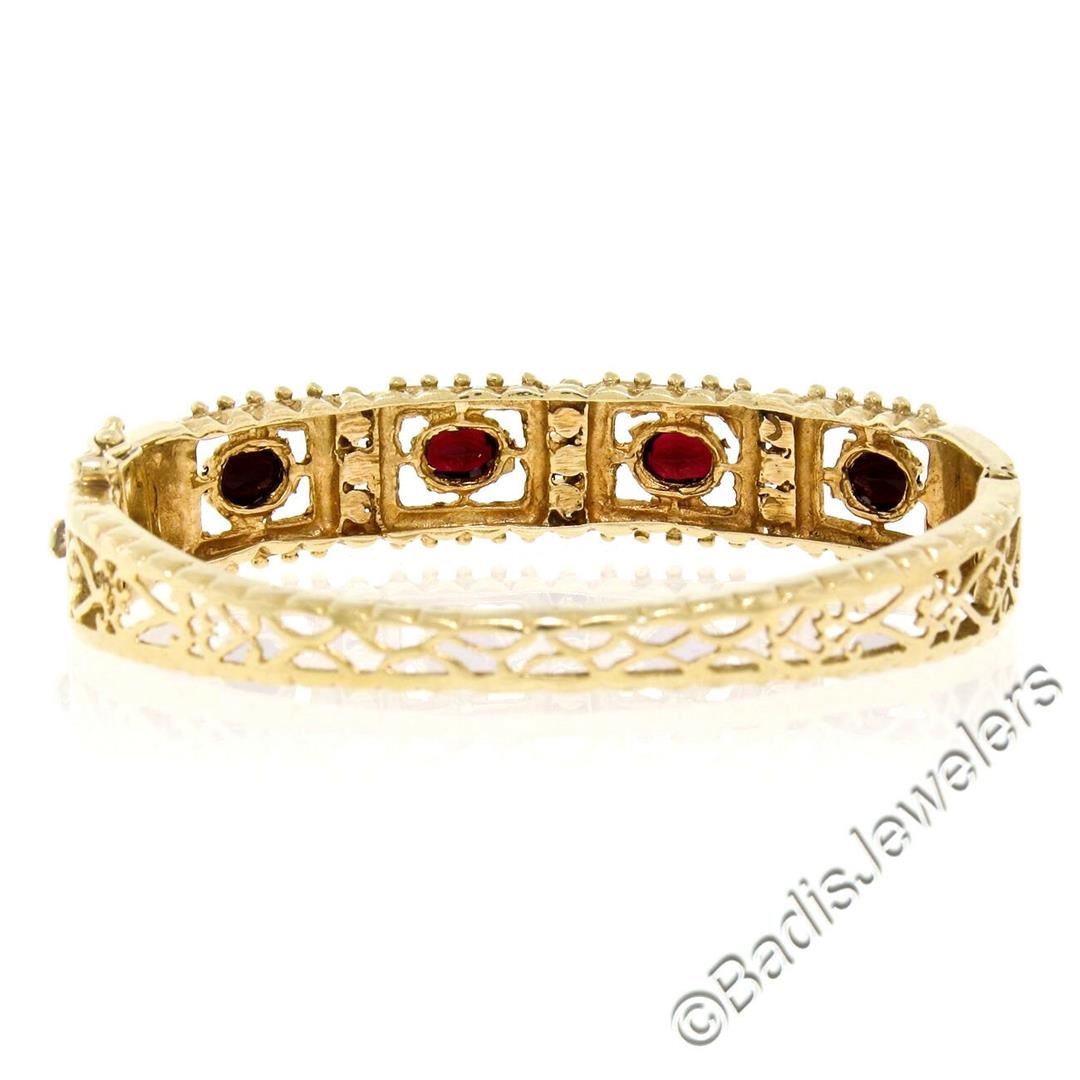 A vintage 14kt yellow gold bangle bracelet with 4.50ctw of oval and round garnets. It weighs a total of 25.08 grams and comfortably fits up to a 6.5 inch wrist.