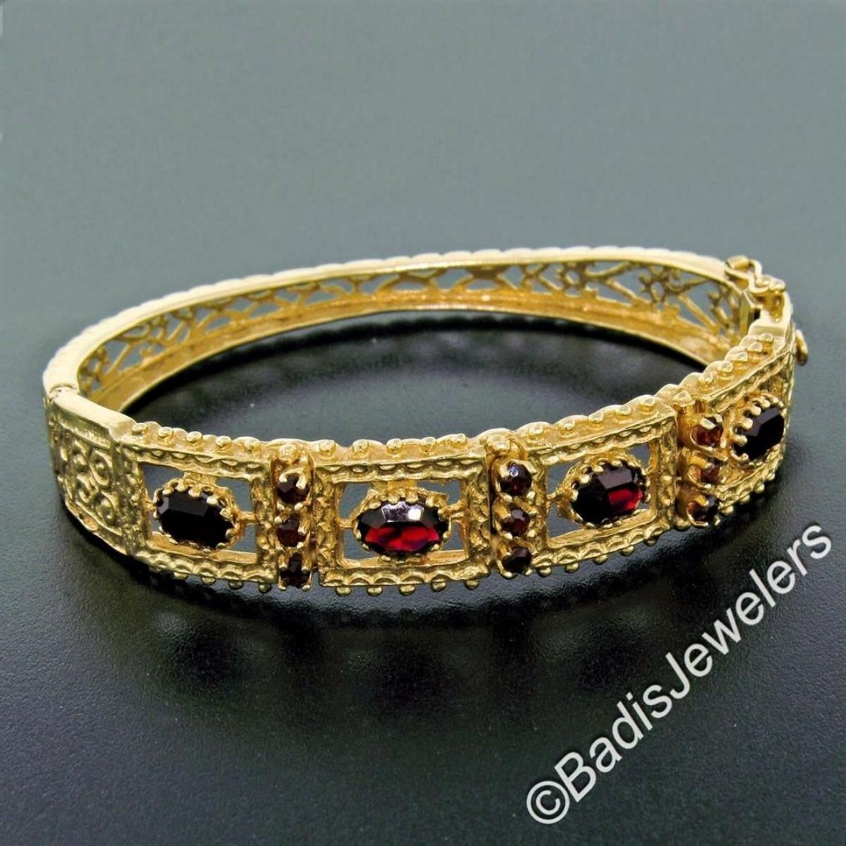 A vintage 14kt yellow gold bangle bracelet with 4.50 ctw of oval and round garnets. It weighs a total of 25.08 grams and comfortably fits up to a 6.5 inch wrist.