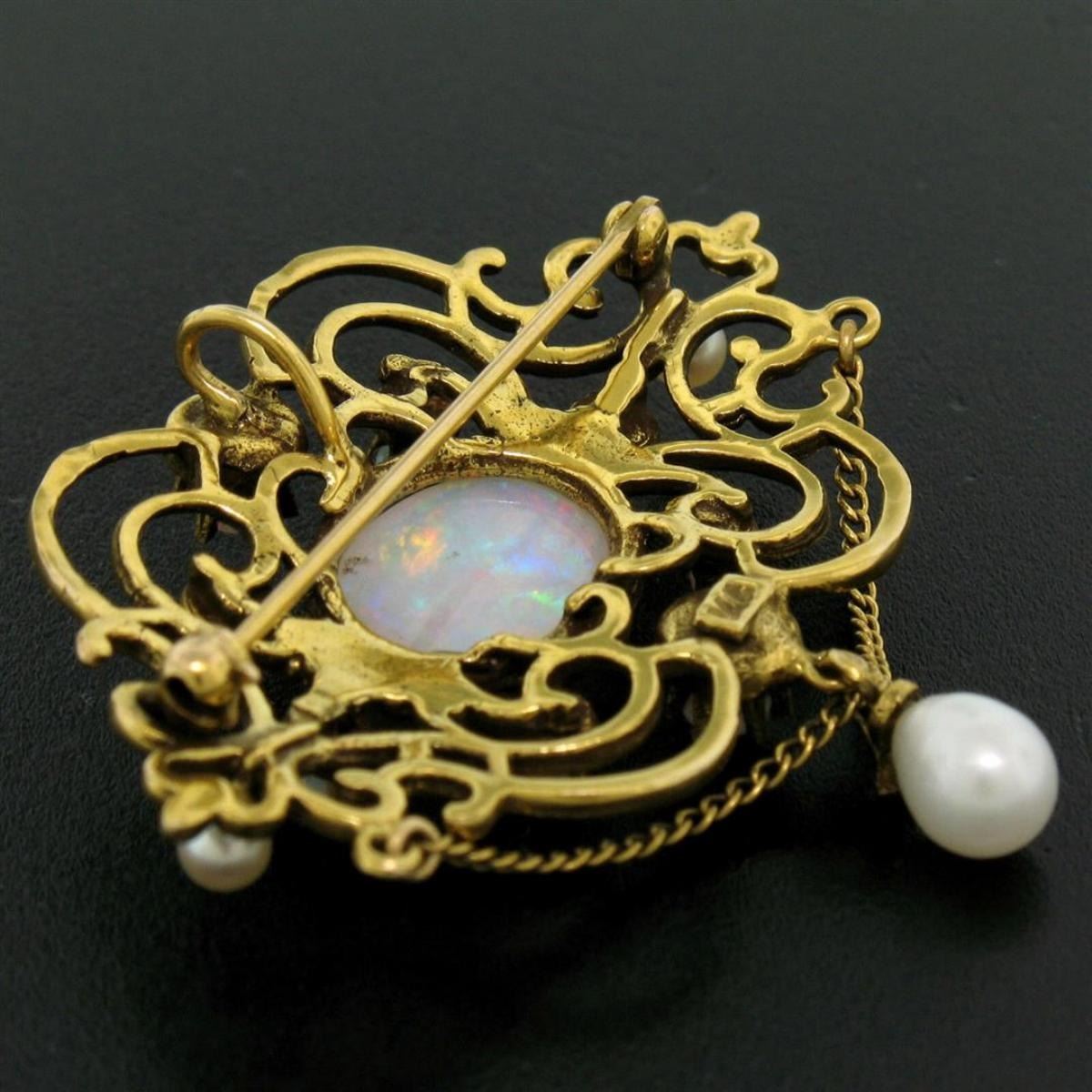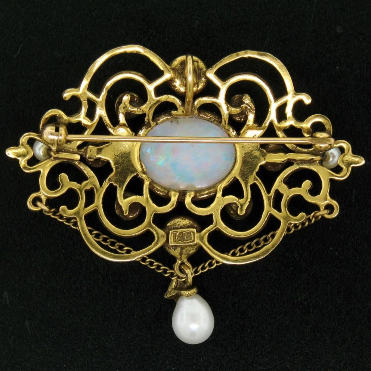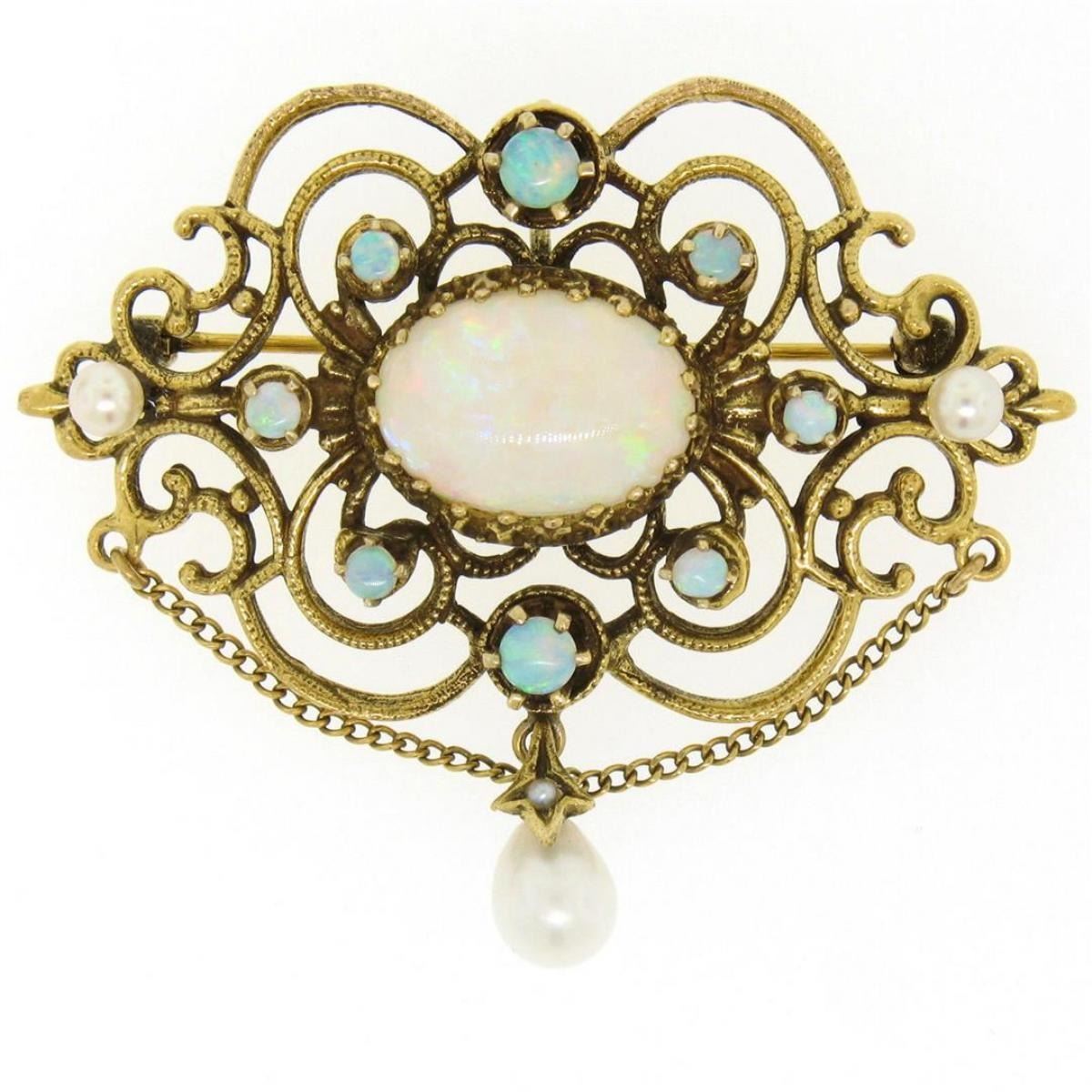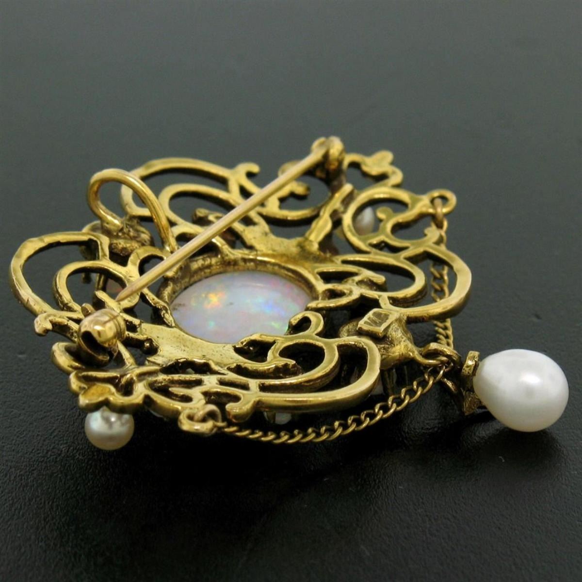 An excellent condition vintage 14kt yellow gold brooch with 4.50 ctw of oval and round cabochon cut opals accented by 4 pearls. Measures 40.3x47.8mm and weighs a total of 11.3 grams.