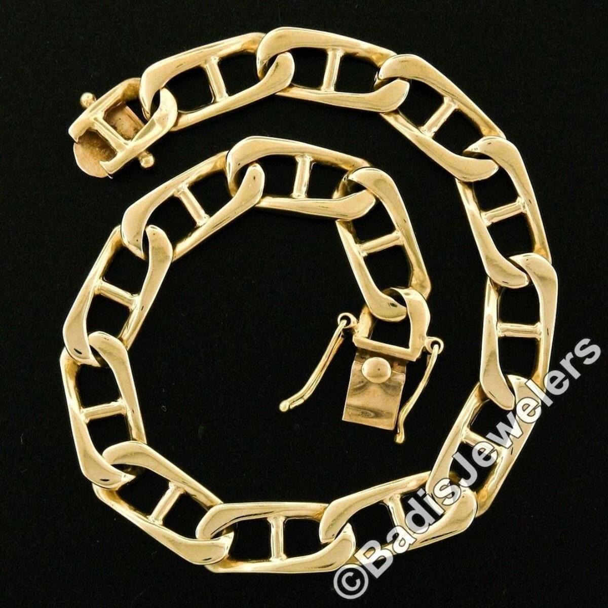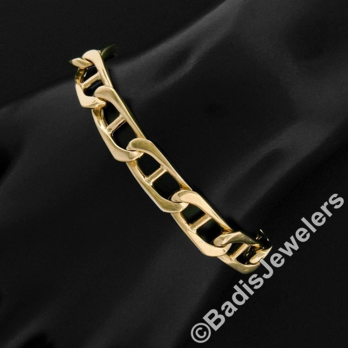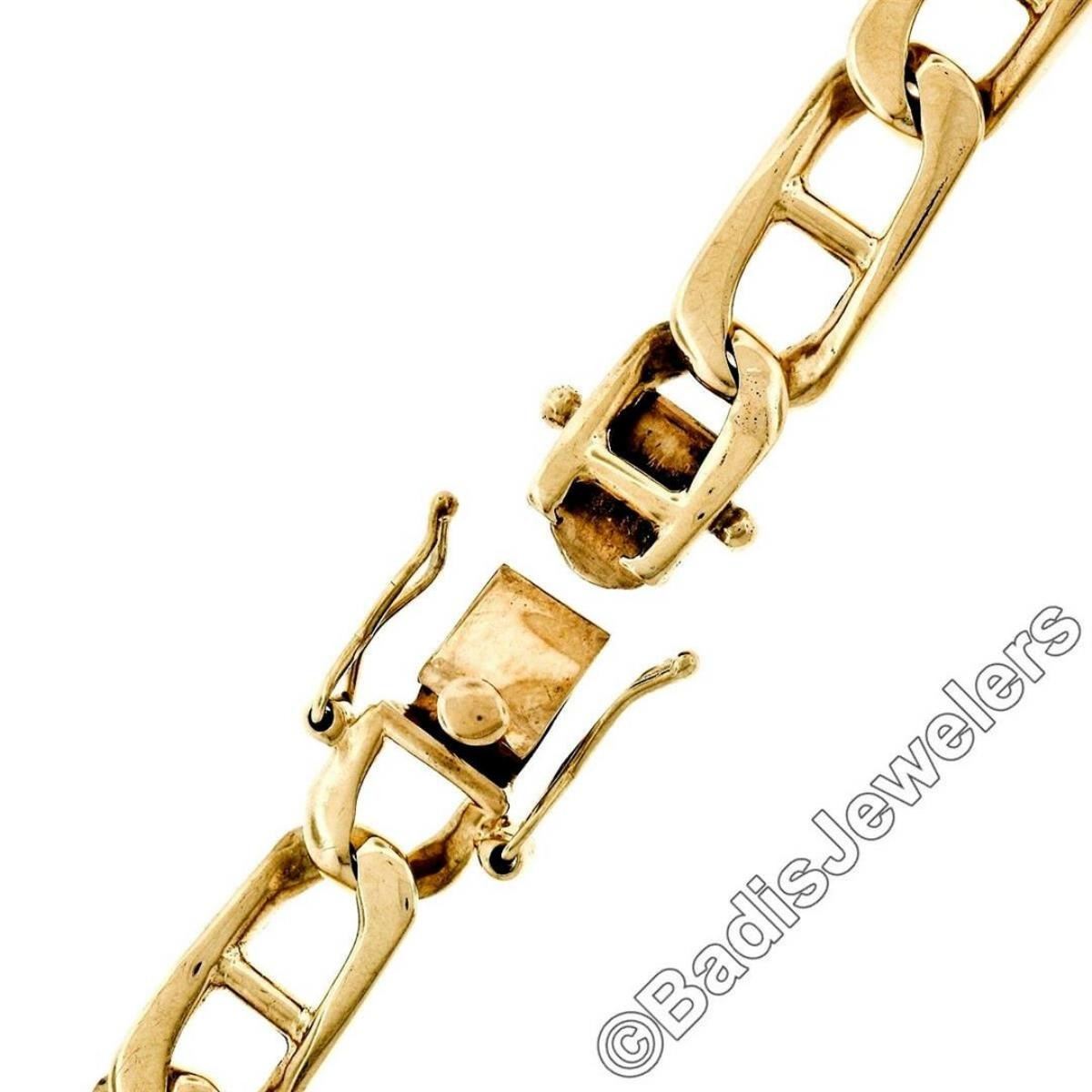 A vintage men's 14kt yellow gold chain bracelet with large 8.4mm gucci links. It weighs a total of 32.94 grams, measures 8.4mm wide, and measures 8.75 inches in length.